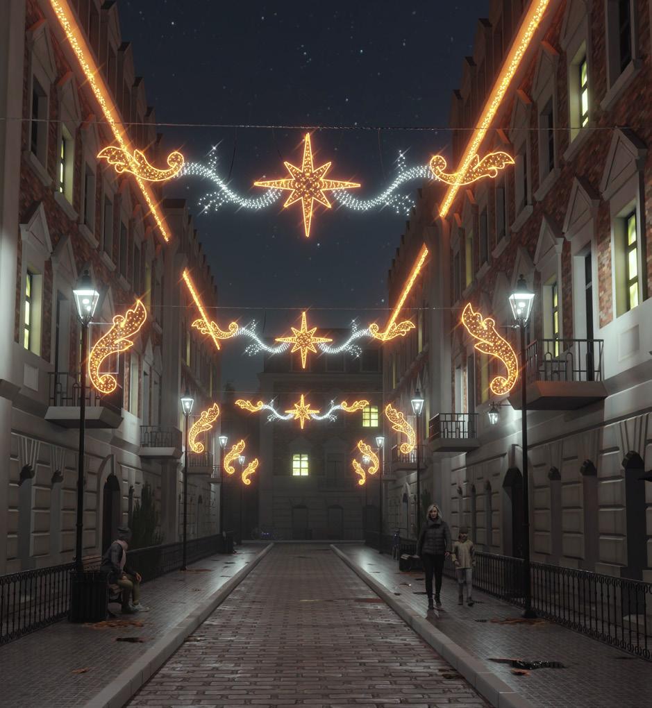 Ob entlang von Straßen, über Plätzen oder in Einkaufszonen –unsere Überspannungen und Mastmotive inszenieren Räume mit Leichtigkeit und Eleganz. Sie schaffen Orientierung, erzeugen Tiefe und verwandeln jedes Stadtbild in eine Bühne aus Licht und Bewegung. Je nach Motiv und Lichtfarbe entstehen so ganz eigene Stimmungen – festlich, einladend oder feierlich.