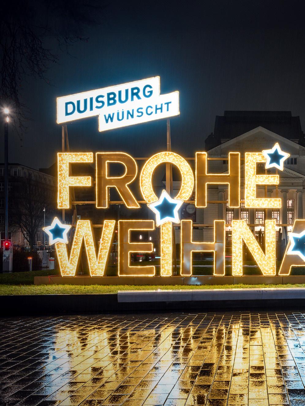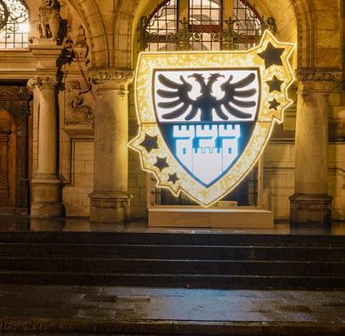Ein illuminiertes und winterlich verziertes Stadtwappen ziert seit dieser Saison den Eingang zum Duisburger Rathaus.