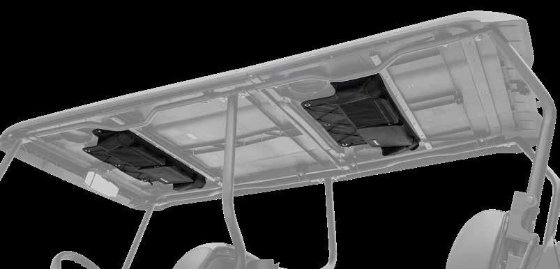 The Overhead Storage compartment features integrated roof mounting, two large zippered pockets, and 2 sunglasses’ pockets • Load capacity: 5 lbs. Integrated roof mounting can accommodate qty (2) Overhead Storage compartments sold separately