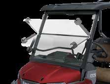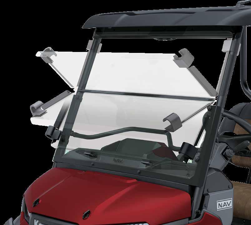 The Flip-Down Windshield, Polycarbonate can be quickly opened or closed when desired • Helps provide protection from wind for improved in-cabin comfort when closed or increased cabin ventilation when open • Features a screen printed, three piece design with a tinted top piece for added glare resistance • Made from scratch-resistant Quantum® hard coated polycarbonate • Standard equipment on NAV® 4e Limited