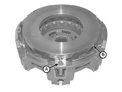 Remove traction clutch disk (A). Note the direction of center hub (B) on disk (A) to aid during installation.