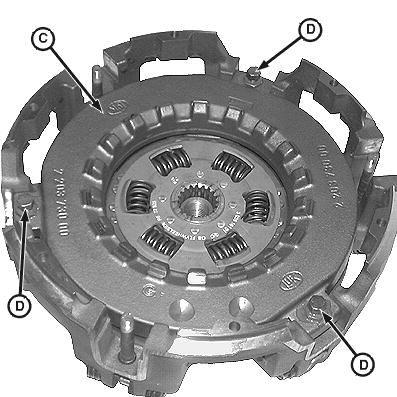 12.Do not loosen or remove three lock nuts and cap screws (D) on traction clutch front pressure plate (C).