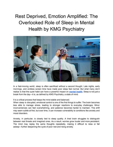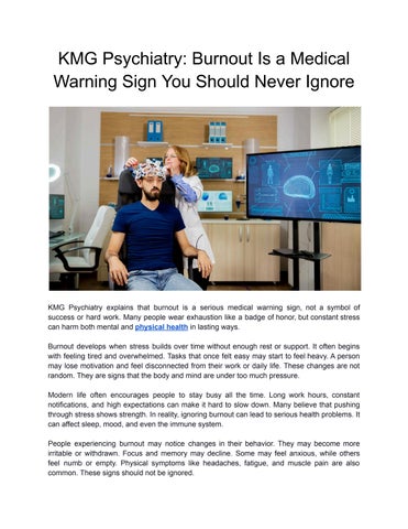 KMG Psychiatry is an integrative outpatient psychiatric practice operating within a larger medical organization, serving patients in San Diego, Chula Vista, and Vista, California. Founded in October 2016, it delivers comprehensive mental health care through psychiatric evaluations, medication management, psychotherapy, and interventional treatments. It specializes in the treatment of depression and post-traumatic stress disorder, with a strong focus on military personnel and underserved communities. It is a national leader in transcranial magnetic stimulation, using FDA-cleared technology and holding a Diamond-level provider designation for administering more than 2,400 treatments each year. The practice was established to address gaps in outpatient psychiatric care, including long wait times and fragmented services. Its philosophy is grounded in the belief that psychiatric conditions rarely respond to one-dimensional care. Following a thorough evaluation, individualized treatment plans are developed and adjusted over time based on clinical progress. KMG Psychiatry provides outpatient services for adults, adolescents, and children when appropriate, treating depression, anxiety disorders, bipolar disorder, post-traumatic stress disorder, autism spectrum disorders, and related conditions. Services also include counseling, forensic mental health services, and sleep medicine care. A defining clinical anchor is transcranial magnetic stimulation. Treatments are delivered in-office with patients awake and comfortable, using targeted magnetic pulses to stimulate brain regions involved in mood regulation. Sessions typically last 19 to 37 minutes, occur five days per week over four to six weeks, and often lead to faster improvement than medication alone. The treatment is noninvasive and allows patients to return to daily activities immediately. Multiple locations and a rapid scheduling model support community access. KMG Psychiatry remains committed to access and outcomes.