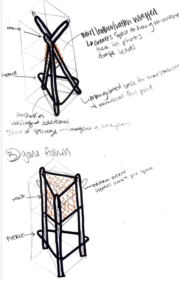 Three stabilizing legs taper up and bend to form hanging rods. Notches secure hanging bags and jackets on the angled rods. The center shelf provides structure and storage.
