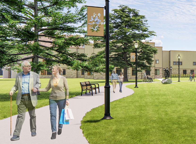 Embracing sensory exploration and community, a public access park and private courtyard gardens with vibrant colors, textures, and water features encourage meaningful interactions between residents, families, staff, and the community.