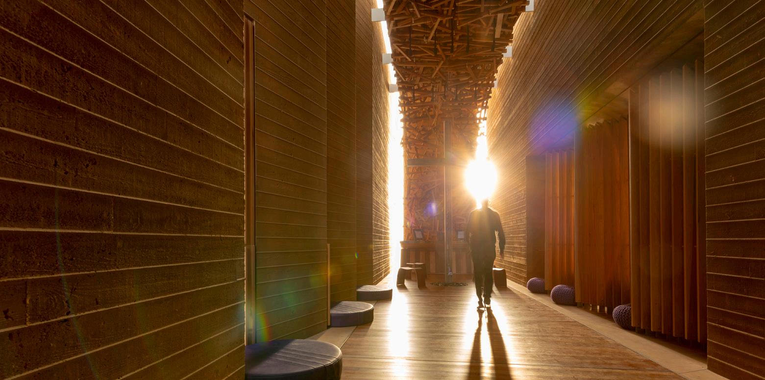The encapsulated nooks with cocoon like wood structures serve for individual moments of prayer. A light canopy overhead made up of organic materials acts as a filter for light to enter the space and sets an intimate mood.