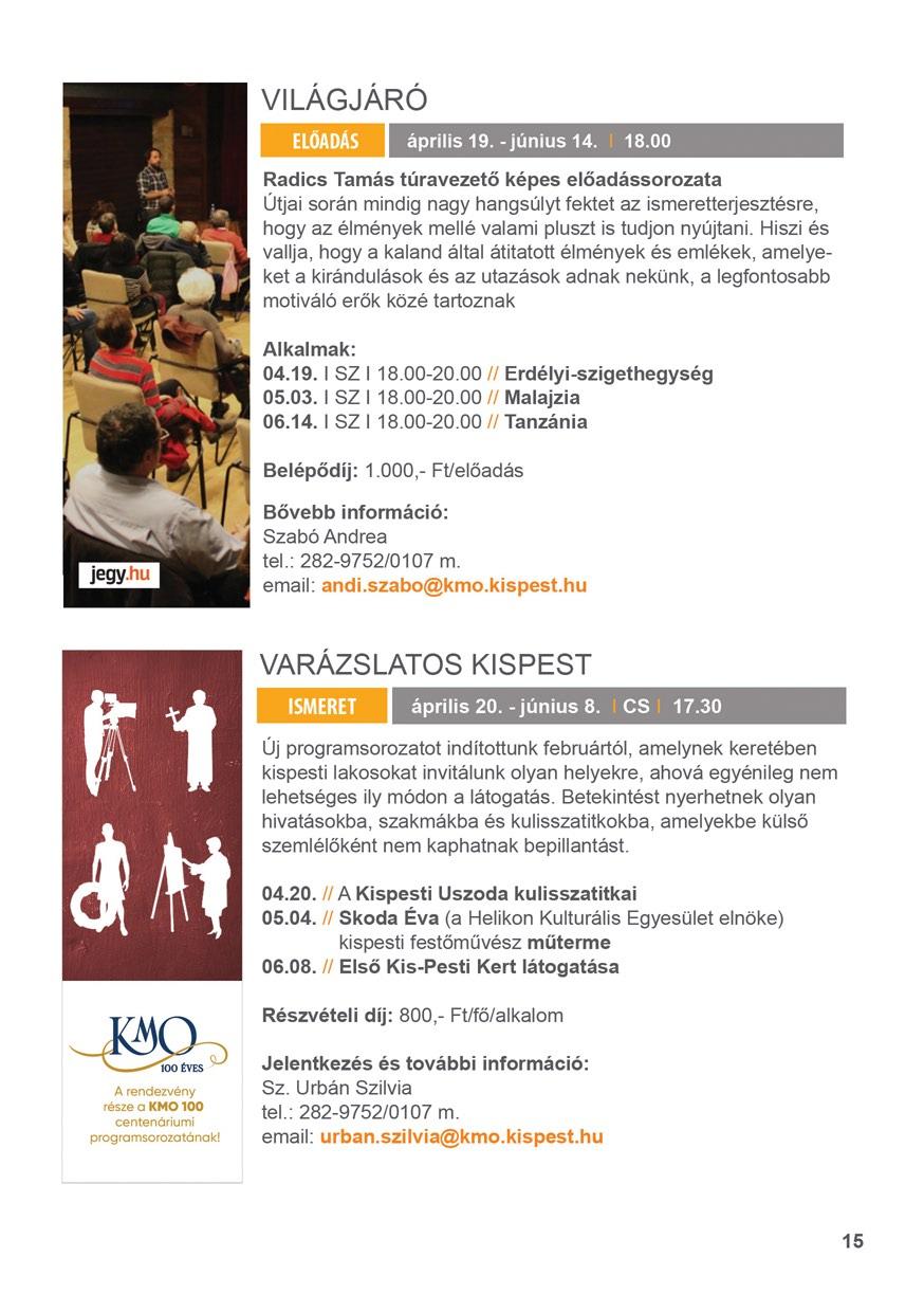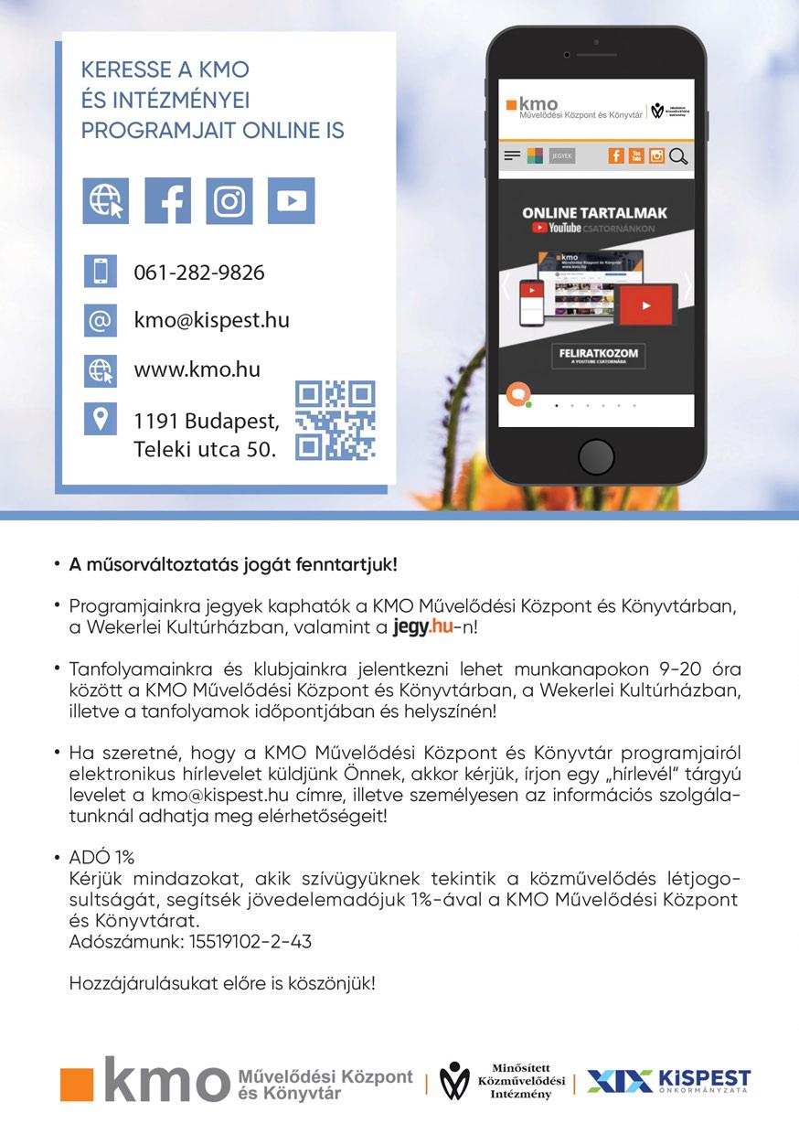 Válogasson programjaink, koncertjeink, színházi előadásaink, bérleteink közül és szerezzen egy kellemes estét családtagjainak, barátainak. Tekintse meg tavaszi, nyári műsorkínálatunkat! A műsorváltoztatás jogát fenntartjuk! Bővebb információ: www.kmo.hu