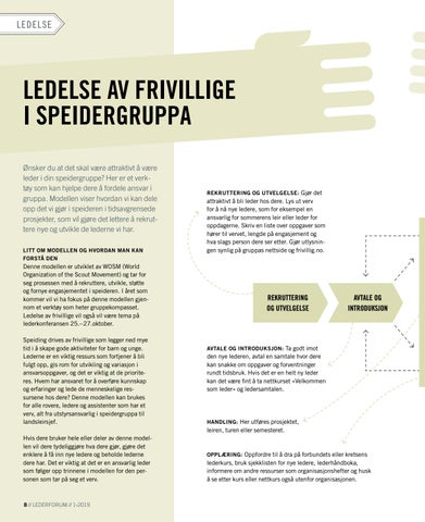 Denne modellen er utviklet av WOSM (World Organization of the Scout Movement) og tar for seg prosessen med å rekruttere, utvikle, støtte og fornye engasjementet i speideren. I året som kommer vil vi ha fokus på denne modellen gjennom et verktøy som heter gruppekompasset. Ledelse av frivillige vil også vil være tema på lederkonferansen 25.–27.oktober. Speiding drives av frivillige som legger ned mye tid i å skape gode aktiviteter for barn og unge. Lederne er en viktig ressurs som fortjener å bli fulgt opp, gis rom for utvikling og variasjon i ansvarsoppgaver, og det er viktig at de prioriteres. Hvem har ansvaret for å overføre kunnskap og erfaringer og lede de menneskelige ressursene hos dere? Denne modellen kan brukes for alle rovere, ledere og assistenter som har et verv, alt fra utstyrsansvarlig i speidergruppa til landsleirsjef. Hvis dere bruker hele eller deler av denne modellen vil dere tydeliggjøre hva dere gjør, gjøre det enklere å få inn nye ledere og beholde lederne dere har. Det er viktig at det er en ansvarlig leder som følger opp trinnene i modellen for den personen som tar på seg et verv.