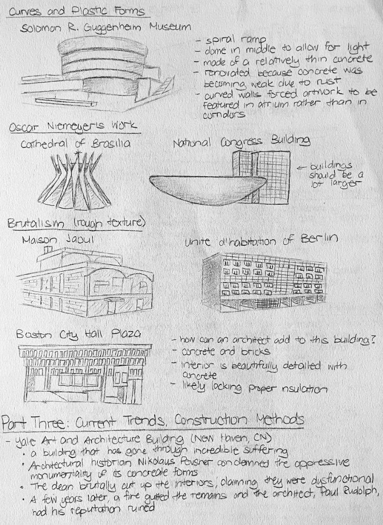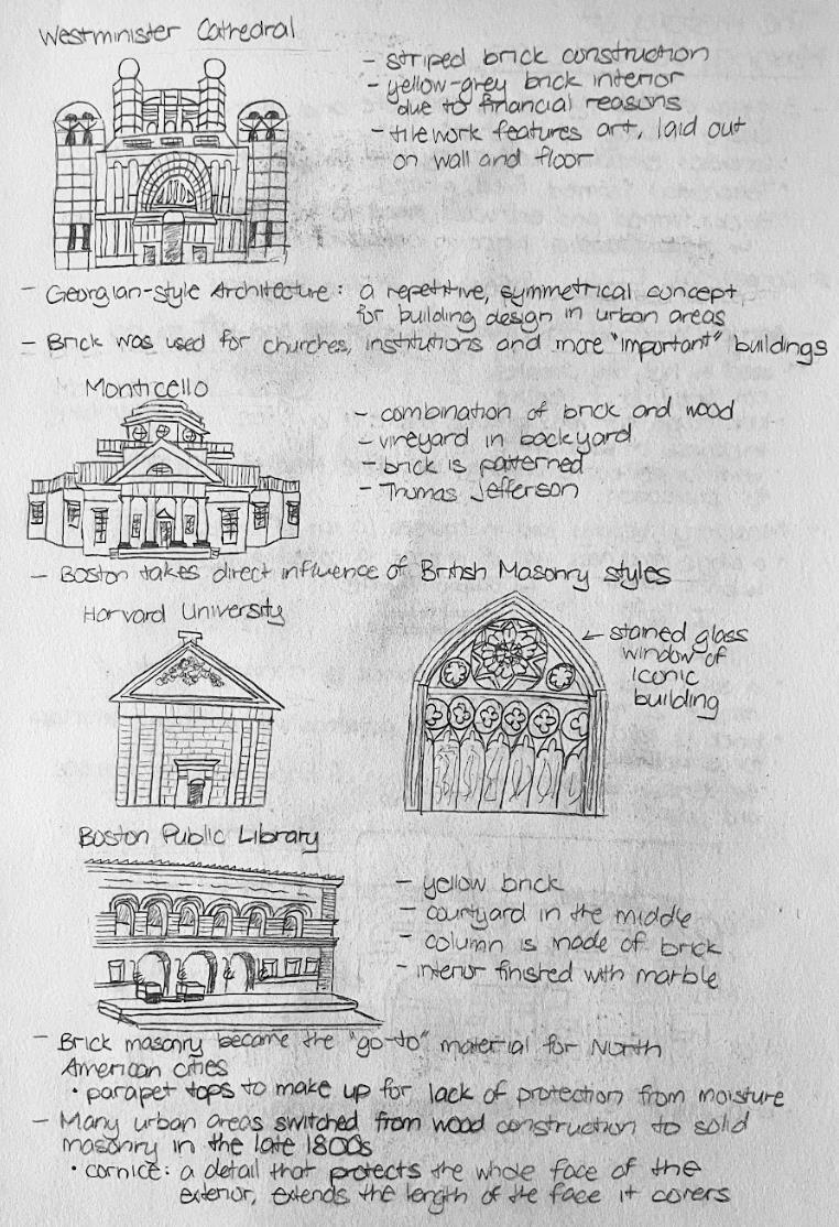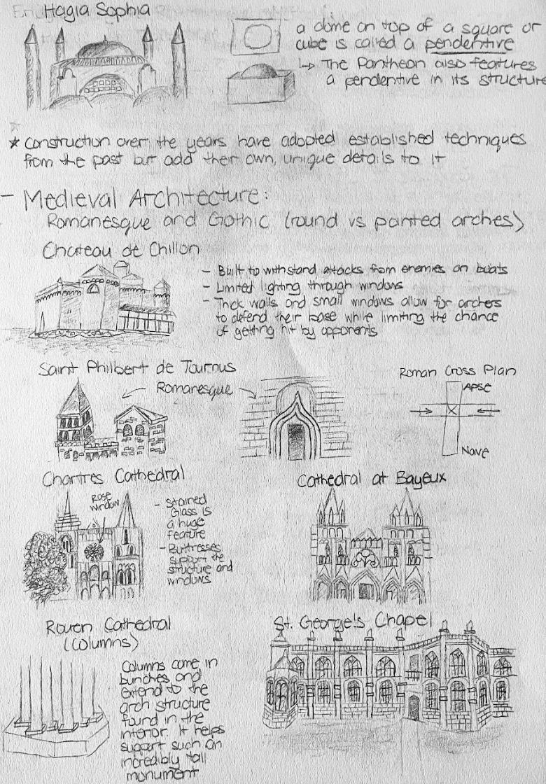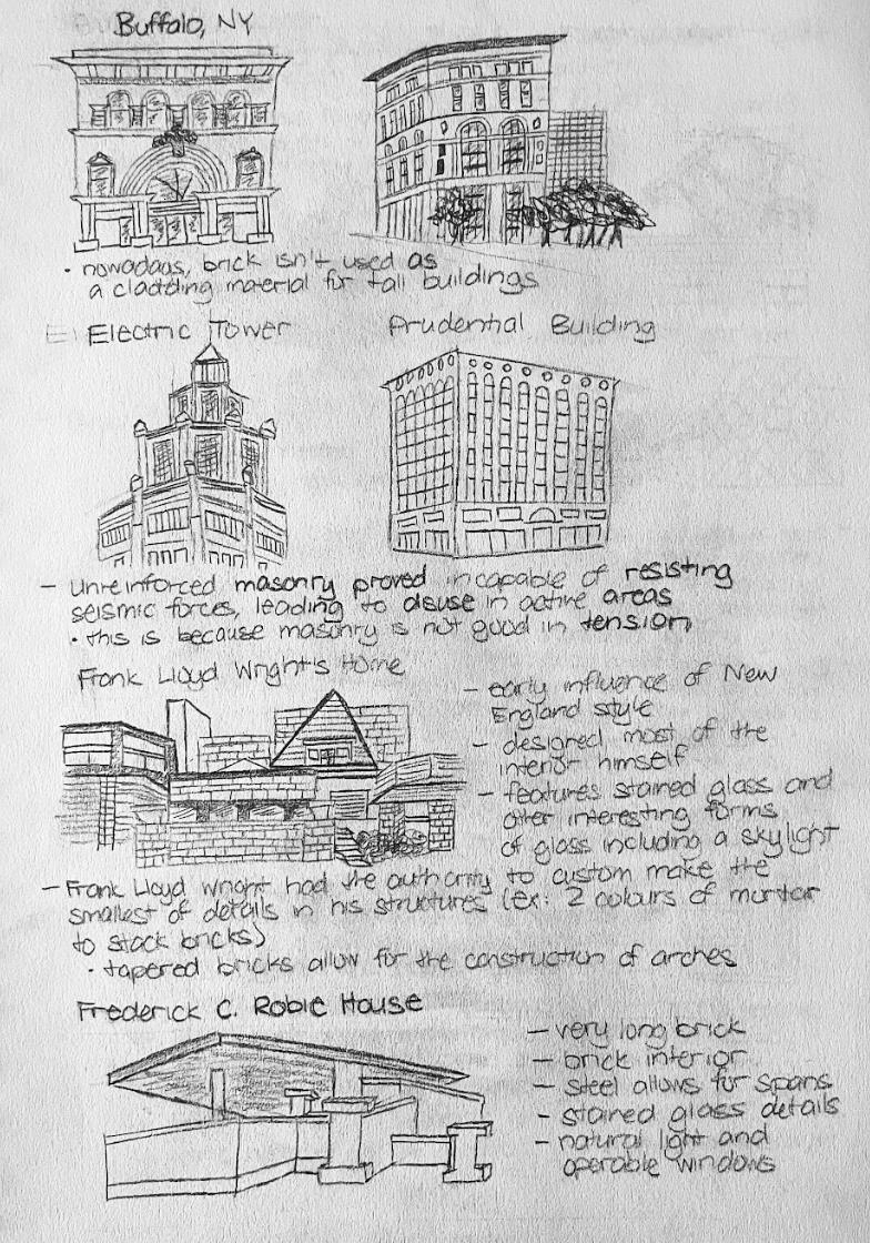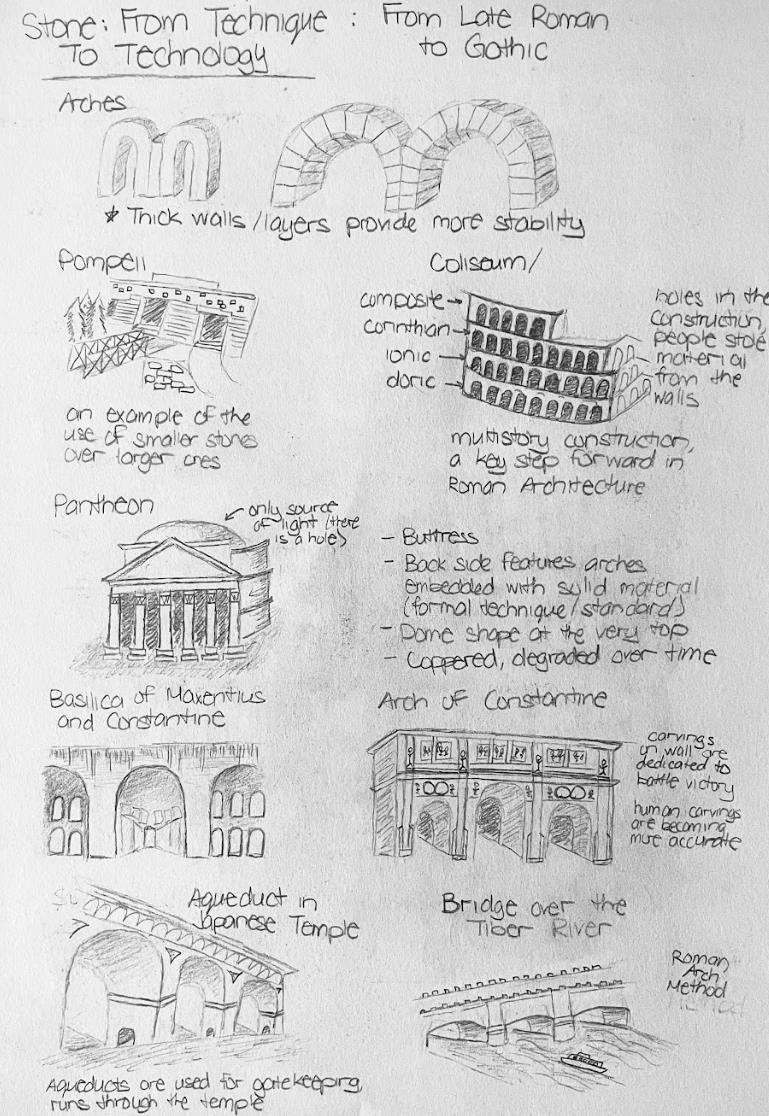 Hand sketches using pencil and pen for a variety of objects, textures and connections. Sketches within notes were done as part of a weekly lecture requirement in an architectural history course taught by Prof. Terri Meyer Boake