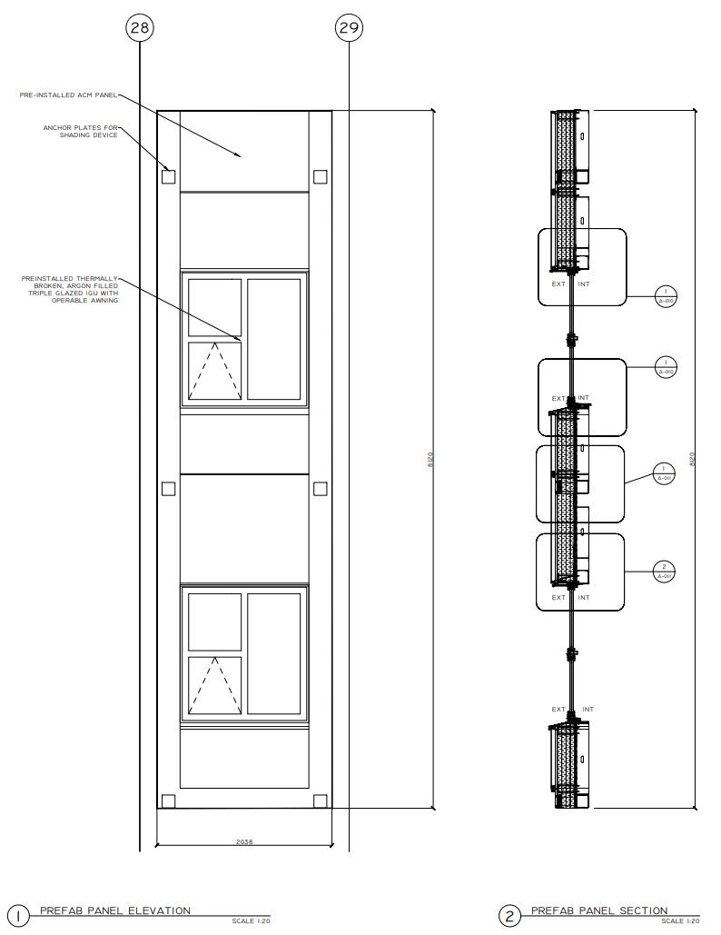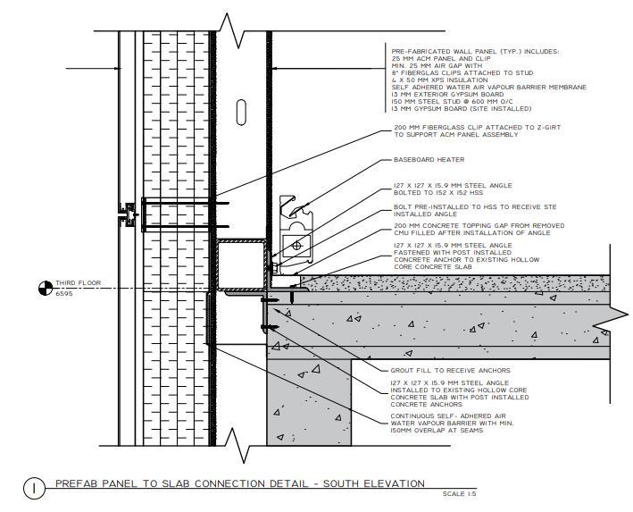 With the University of Waterloo offering co-op for most of their programs, it is pivotal to finish the retrofit in a short period of time. To accelerate the construction process, the design features prefabricated construction for the second and third floor enclosure system. The prefab panel consists of the ACM panels and windows within a bay of the façade, It also features the hollow structural steel supports for the shading device, allowing for relatively quick installation on site.
