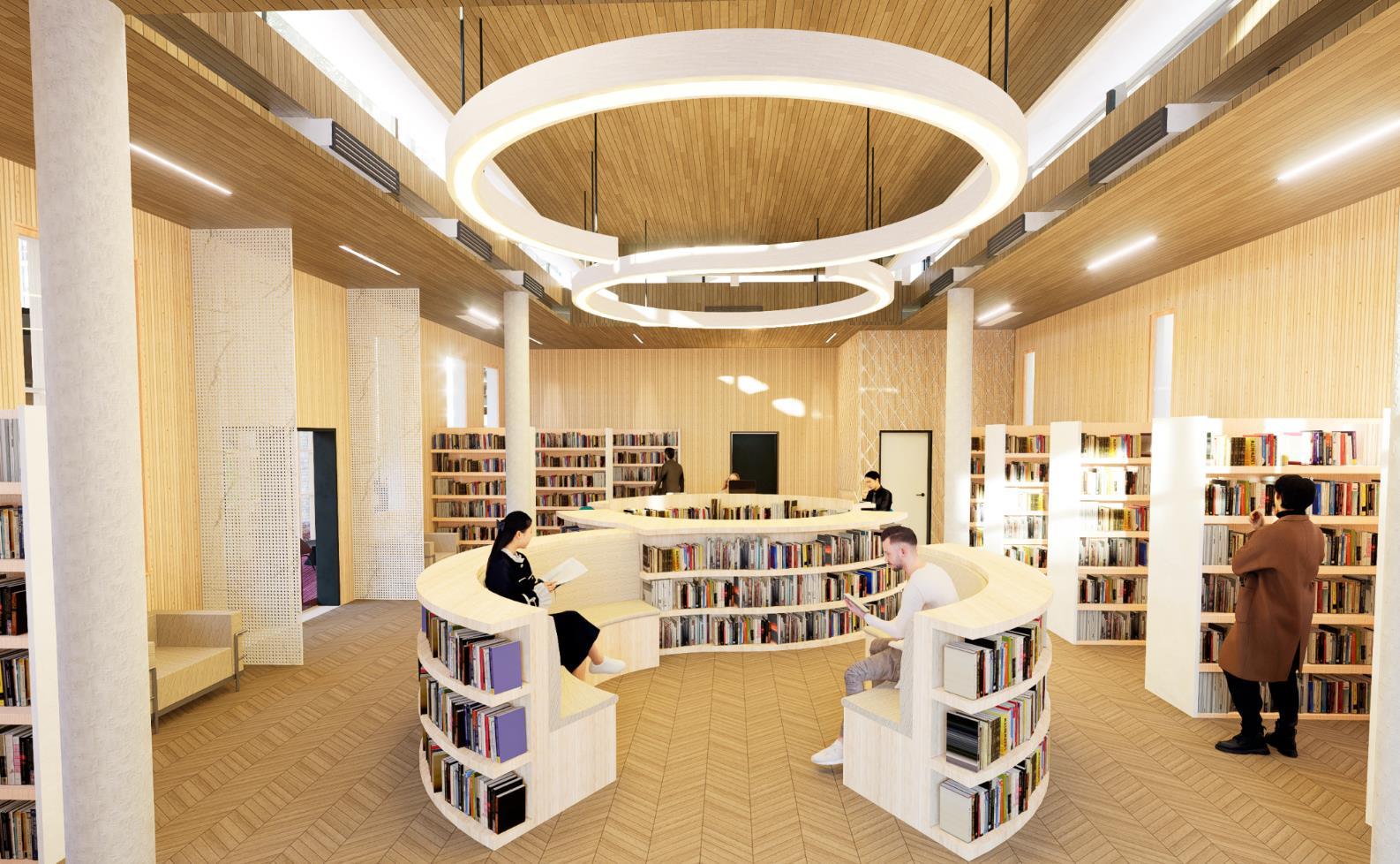 The 18 m x 10 m tiny library design is governed by a central seating area in the shape of a segmented infinity loop. The infinity loop design is projected up into the central light fixture. Beyond the light fixture is a dual-purpose, mechanicallyautomated recessed roofing system that promotes natural daylighting during the day and night-flushing during the night by opening the glazing units to let warm air exit the building. The interior is primarily finished with wood to foster productivity and wellness.