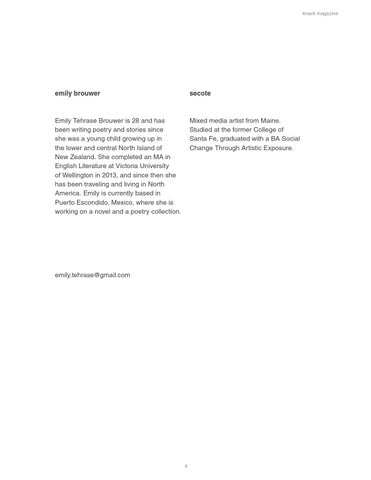 Emily Tehrase Brouwer is 28 and has been writing poetry and stories since she was a young child growing up in the lower and central North Island of New Zealand. She completed an MA in English Literature at Victoria University of Wellington in 2013, and since then she has been traveling and living in North America. Emily is currently based in Puerto Escondido, Mexico, where she is working on a novel and a poetry collection.