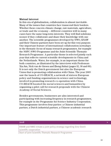 Mutual interest In this era of globalisation, collaboration is almost inevitable. Many of the issues that countries face transcend their borders. Whether these concern climate change, raw materials, agriculture, or trade and the economy – different countries will in many cases have the same long-term interests. They will find solutions sooner if they collaborate and share their knowledge with one another. The scientific programmes developed by NWO, KNAW and their Chinese partners have been set up for this very purpose. One important feature of international collaboration nowadays is the thematic focus of many research programmes, for example the NSFC-NWO Programme and the Joint Scientific Thematic Research Programme. A particular theme is selected jointly each year that reflects current scientific developments in China and the Netherlands. Water, for example, is an important theme for both countries, as illustrated by the interviews with Professors Xia Jun, Nick van de Giesen and Zheng Jinhai (pages 32, 36 and 60). It is not only the Dutch government but also the European Union that is promoting collaboration with China. The year 2005 saw the launch of CO-REACH, a network of sixteen European policy and funding organisations in science and technology, involved in promoting research co-operation with China. CO-REACH boosted the social sciences and humanities by organising a pilot call for research proposals with the Chinese Academy of Social Sciences. Besides governments, businesses are also interested and participating with increasing frequency in research programmes, for example in the Programme for Science Industry Cooperation. This programme involves four parties: a Chinese industrial partner, a Dutch industrial partner, a Chinese academic research