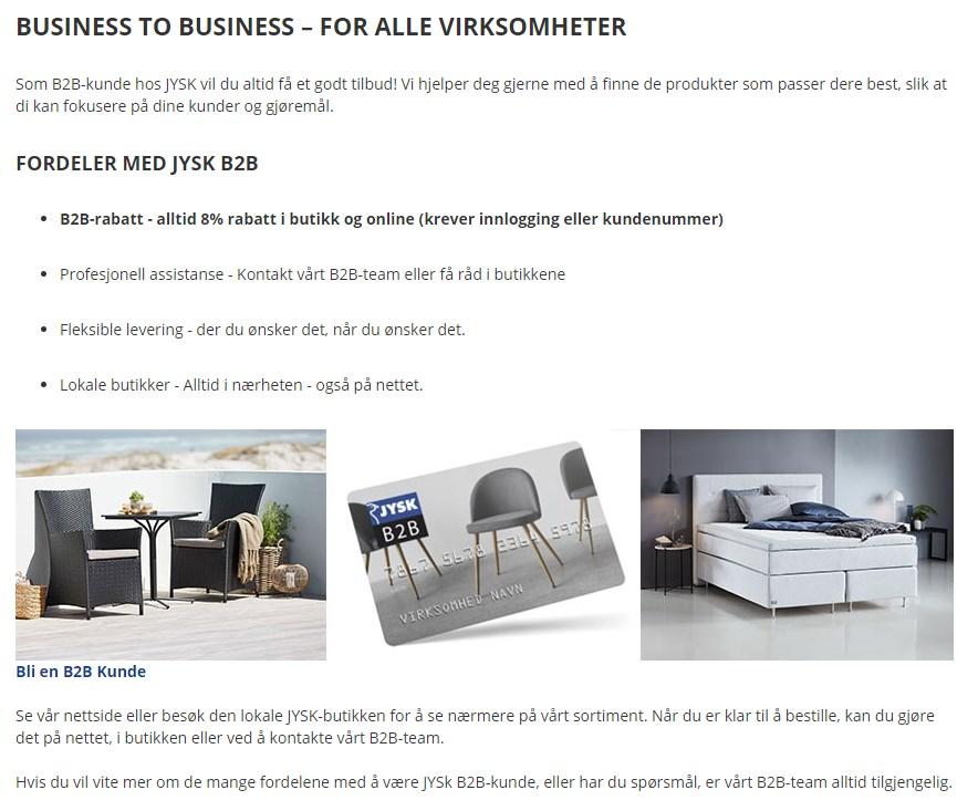 Send din bestilling på e-post til: B2B-no@JYSK.com Ved spørsmål: Kontakt oss på tlf: 22 07 87 50 Alle salgspriser er eksklusive mva. Kampanjen er gyldig til og med 25.06.2023 Kampanjen er gyldig til og med 25.06.2023 | Send din bestilling på e-post til: b2b-no@JYSK.com