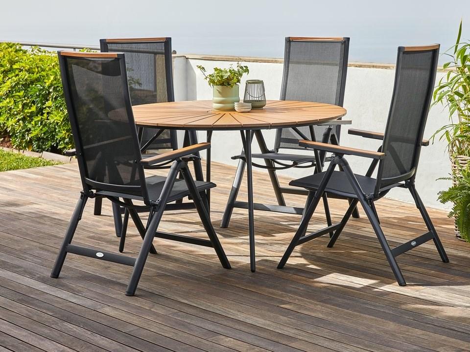 Vedlikeholdsfri 6 posisjonsstol i aluminium, textilene og kunsstre. Sammenleggbar.