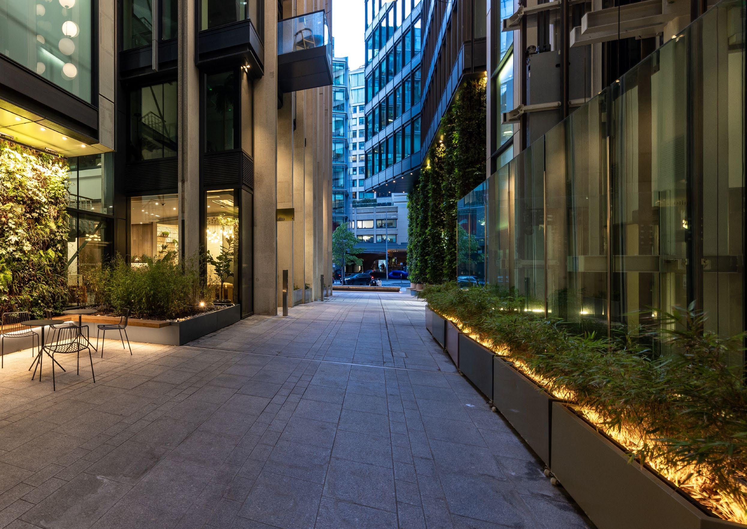 The landscaping element included green walls and columns, moveable planters, and benching all of which incorporate Dali dimmable lighting set to an astronomical timeclock to transition throughout the day to complement the prevailing light levels.