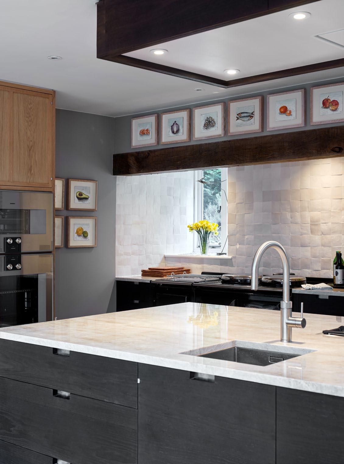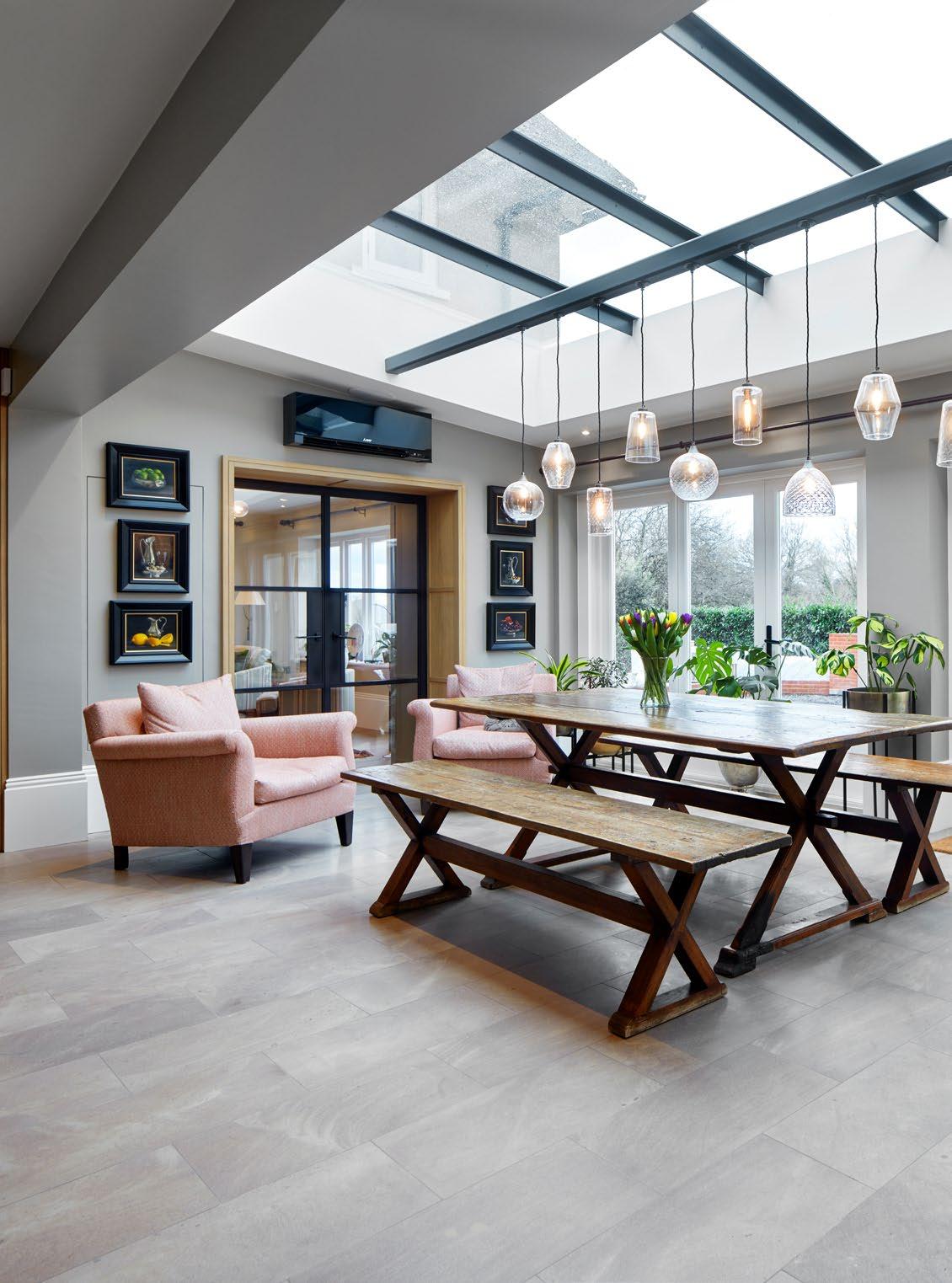 The scope included two extensions to provide an orangery with a walk-on glass roof, an enlarged kitchen, refurbished exposed timber framing, wet-room-style bathrooms, bespoke joinery and kitchen, a master bedroom suite, solid wood flooring, underfloor heating, energyefficient services, a back-up generator and extensive soft and hard landscaping.