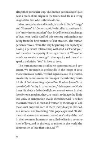 words, we receive a great gift: the capacity and the call to speak a definitive “Yes,” in love, to Love. The human person is called to communion and covenant. We are made so profoundly in the image of Love that even in our bodies, we find signs of a call to a fruitful, creaturely communion that images the infinitely fruitful life of God. According to John Paul II, when Jesus Christ reveals God’s “unity in communion,” this mystery of God’s inner life sheds a definitive light on man and woman. In their love for one another, they are meant to image the limitless unity in communion that is the triune God. “The fact that man ‘created as man and woman’ is the image of God means not only that each of them individually is like God, as a rational and free being,” the pope explained. “It also means that man and woman, created as a ‘unity of the two’ in their common humanity, are called to live in a communion of love, and in this way to mirror in the world the communion of love that is in God.”26