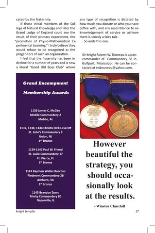 cated by the fraternity. any type of recognition is dictated by If those initial members of the Col- how much you donate or who you have lege of Natural Knowledge and later the coffee with, and any resemblance to acGrand Lodge of England could see the knowledgement of service or achieveresult of their primary experiment, the ment is strictly a fairy tale. “promotion of Physio-Mathematical ExSo ends this one. perimental Learning,” I truly believe they would refuse to be recognized as the progenitors of such an organization. Sir Knight Robert W. Bruneau is a past I feel that the fraternity has been in commander of Commandery 38 in decline for a number of years and is now Gulfport, Mississippi. He can be cona literal “Good Old Boys Club” where tacted at rwbruneau@yahoo.com.