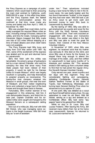 the Pony Express as a campaign of public relations which would lead to their procuring the main mail contract to California, worth $600,000.00 a year. In this effort they failed, and the Pony Express itself, the fastest means of communication across the continent at that time, never made any money and lasted only from April 3, 1860, to November 18, 1861. Billy was younger than most riders, but he easily averaged his required fifteen miles an hour, including change of horses, detours for safety, and time for meals. Company partner Alexander Majors bragged that Billy made one ride of 322 miles without stopping at a time of Indian attacks and when relief riders were not available. The Pony Express kept Billy busy and away from Civil War action until 1861. By then, some of the excitement of the express was abated and he quit and returned home to Leavenworth. Bill's first hitch with the militia was lamentable. He joined a group of jayhawkers led by a man named Chandler, who sold his company the idea that since many Free State people had been robbed of their property, it would be right for his Kansas militia to invade Missouri, which was largely Southern in sympathy, and help themselves to peoples' property as recompense. The twenty-five man company sneaked into Missouri in small groups, met near the town of Westport, and then visited neighboring farms and collected a large herd of the best horses and brought them back to Kansas. Fortunately, Bill's mother learned of his engagement in this enterprise, told him it was dishonorable thievery, and forbid him to take part. Captain Chandler and his socalled militia were caught and hanged by the Missouri farmers on a subsequent raiding expedition. Now out of a militia job, Billy met with Wild Bill Hickok, who was managing some oxtrains in the freight business. Wild Bill hired Billy as "a sort of assistant