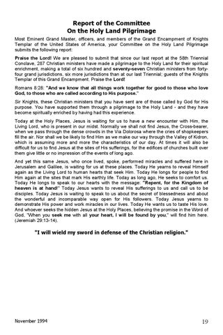 Report of the Committee On the Holy Land Pilgrimage Most Eminent Grand Master, officers, and members of the Grand Encampment of Knights Templar of the United States of America, your Committee on the Holy Land Pilgrimage submits the following report: Praise the Lord! We are pleased to submit that since our last report at the 58th Triennial Conclave, 287 Christian ministers have made a pilgrimage to the Holy Land for their spiritual enrichment, making a total of six hundred and seventy-seven Christian ministers from fortyfour grand jurisdictions, six more jurisdictions than at our last Triennial; guests of the Knights Templar of this Grand Encampment. Praise the Lord! Romans 8:28: "And we know that all things work together for good to those who love God, to those who are called according to His purpose." Sir Knights, these Christian ministers that you have sent are of those called by God for His purpose. You have supported them through a pilgrimage to the Holy Land - and they have become spiritually enriched by having had this experience. Today at the Holy Places, Jesus is waiting for us to have a new encounter with Him, the Living Lord, who is present in our midst. Normally we shall not find Jesus, the Cross-bearer, when we pass through the dense crowds in the Via Dolorosa where the cries of shopkeepers fill the air. Nor shall we be likely to find Him as we make our way through the Valley of Kidron, which is assuming more and more the characteristics of our day. At times it will also be difficult for us to find Jesus at the sites of His sufferings, for the edifices of churches built over them give little or no impression of the events of long ago. And yet this same Jesus, who once lived, spoke, performed miracles and suffered here in Jerusalem and Galilee, is waiting for us at these places. Today He yearns to reveal Himself again as the Living Lord to human hearts that seek Him. Today He longs for people to find Him again at the sites that mark His earthly life. Today as long ago, He seeks to comfort us. Today He longs to speak to our hearts with the message: "Repent, for the Kingdom of heaven is at hand!" Today Jesus wants to reveal His sufferings to us and call us to be disciples. Today Jesus is waiting to speak to us about the secret of blessedness and about the wonderful and incomparable way open for His followers. Today Jesus yearns to demonstrate His power and work miracles in our lives. Today He wants us to taste His love. And whoever seeks the hidden Jesus at the Holy Places, believing the promise in the Word of God, "When you seek me with all your heart, I will be found by you," will find him here. (Jeremiah 29:13-14).