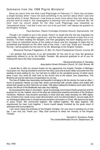 Comments from the 1998 Pilgrim Ministers! Since my return from the Holy Land Pilgrimage on February 11, there has not been a single Sunday when I have not said something in my sermon about what I saw and learned while in Israel. Because I now know so much more about how real Jesus was and the land he lived in, the congregation is learning from me what I learned. My "off time" from my church duties for the Holy Land Pilgrimage was classified as "educational leave," and did it ever turn out to be just that! I will always be grateful to the Knights Templar. Paul Denham, Pastor Fruitridge Christian Church, Sacramento, CA Though I am unable to put it into words, there's no doubt that the trip has impacted me profoundly; my faith has taken a good turn, and the results will continue to bear fruit in my ministry. I've been reading the Gospels, and their geography has been leaping out to me, and I have an intensified sense of the reality of Jesus and the message of hope that he proclaimed and became on the other side of the cross. I can't say "thank you" enough for the trip. I will be grateful for the rest of my life. Blessings to the Knights Templar. Reverend Thomas P Eggebeon, D. Min. St. Paul's Presbyterian Church, Livonia, MI I am positive that everyone of us will remember for the rest of our lives the generous opportunity offered to us by the Knights Templar. My personal gratitude to all of you for making this trip to the Holy Land possible. Reverend Demetrios S. Kavadas Assumption Greek Orthodox Church, St. Clair Shores, MI I would like to offer my sincere thanks for the opportunity the Knights Templar of Michigan have given me. Having traveled to and from the Holy Land and at least mildly recovered from the backlog of work waiting for me, I've had time to reflect on the wonderful journey of which we've been a part. Our send off, both here at the church and at the airport, was stupendous. The Brothers set just the right tone of expectation for our trip. The Sea of Galilee was fascinating and beautiful in bringing to life the stories I've read so often. I found of particular interest our boat ride, which commenced with smooth waters and ended with waves that caused us all to hold onto our seats. Talk about making the Scripture come alive! And, of course, the Mount of the Beatitudes was also very inspiring. As we passed the days in Jerusalem, I grew increasingly convinced of God's presence and the purpose for my trip. Indeed, many of the sites we visited were powerful reminders of the Scripture narratives. However, they became secondary to what God was really showing me: With eightyfour ministers from nearly every major denomination (and non-denomination!), we put aside all of our theological differences to simply become brothers and sisters in Christ. We became the body of Jesus Christ. We communed together. We walked together. We slept together. We experienced the risen Lord together. I found myself deeply humbled by the great cloud of witnesses that surrounded me. I can never repay the kindness of the Knights Templar. For your love in sending me on this trip, I can only say "thank you." May God continue to bless the ministry of the Knights Templar. Kenneth C. Dunstone, Pasto The United Methodist Church, Stephenson, MI