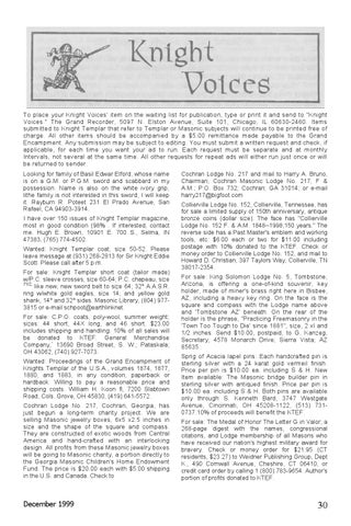 To place your Knight Voices' item on the waiting list for publication, type or print it and send to "Knight Voices." The Grand Recorder, 5097 N. Elston Avenue, Suite 101, Chicago, IL 60630-2460. Items submitted to Knight Templar that refer to Templar or Masonic subjects will continue to be printed free of charge. All other items should be accompanied by a $5.00 remittance made payable to the Grand Encampment. Any submission may be subject to editing. You must submit a written request and check, if applicable, for each time you want your ad to run. Each request must be separate and at monthly Intervals, not several at the same time. All other requests for repeat ads will either run just once or will be returned to sender. Looking for family of Basil Edwar Elford, whose name is on a G.M. or P.G.M. sword and scabbard in my possession. Name is also on the white ivory grip, lithe family is not interested in this sword, I will keep it. Rayburn R. Poteet 231 El Prado Avenue, San Rafael, CA 94903-3914. I have over 150 issues of Knight Templar magazine, most in good condition (98% . If interested, contact me. Hugh E. Brown, 10901 E. 700 S., Selma, IN 47383, (765) 774-4502. Wanted: Knight Templar coat, size 50-52. Please leave message at (931) 268-2813 for Sir Knight Eddie Scott. Please call after 5 p.m. For sale: Knight Templar short coat (tailor made) w/P.C. sleeve crosses, size 60-64; P.C. chapeau, size 71/2, like new; new sword belt to size 64; 32째 A.A.S.R. ring w/white gold eagles, size 14; and yellow gold shank, 14째 and 32째 sides. Masonic Library, (804) 9773815 or e-mail schpoot@earthlinknet. For sale: C.P.O. coats, poly-wool, summer weight; sizes: 44 short, 44X long, and 46 short. $23.00 includes shipping and handling. 10% of all sales will be donated to KTEF. General Merchandise Company,- 13690 Broad Street, S. W.; Pataskala; OH 43062, (740) 927-7073. Wanted: Proceedings of the Grand Encampment of Knights Templar of the U.S.A., volumes 1874, 1877, 1880, and 1883, in any condition, paperback or hardback. Willing to pay a reasonable price and shipping costs. William H. Koon fl, 7200 Slabtown Road, Cols. Grove, OH 45830, (419) 641-5572. Cochran Lodge No. 217, Cochran, Georgia, has just begun a long-term charity project. We are selling Masonic jewelry boxes, 6x5 x2.5 inches in size and the shape of the square and compass. They are constructed of exotic woods from Central America and hand-crafted with an interlocking design. All profits from these Masonic jewelry boxes will be going to Masonic charity, a portion directly to the Georgia Masonic Children's Home Endowment Fund. The price is $20.00 each with $5.00 shipping in the U.S. and Canada. Check to