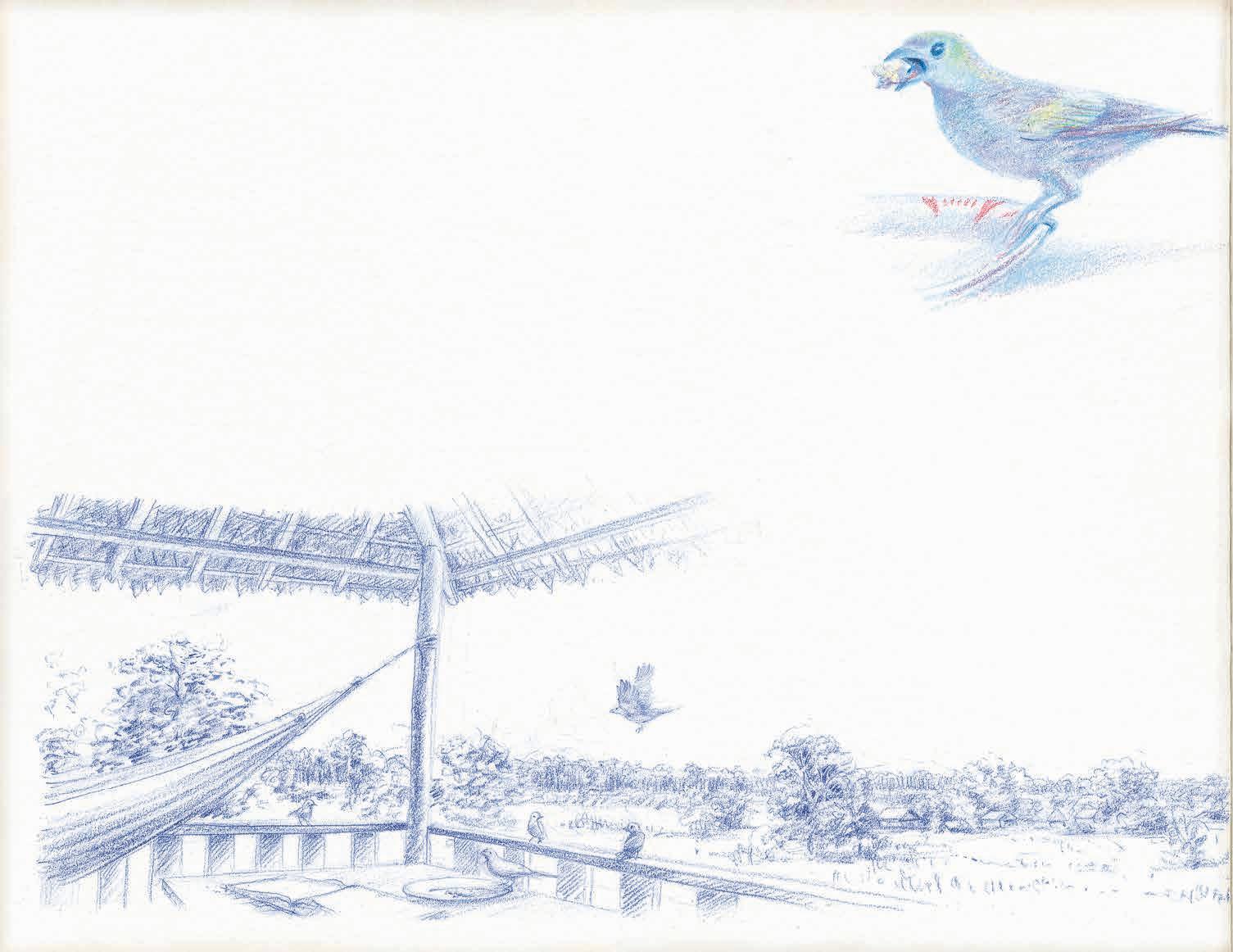 Píšu z pohodlí své hamaky a sleduju malinké ptáčky, jak na stole vyzobávají drobky od snídaně. Kromě jejich švitoření se savanou rozléhá cvrčení cikád. Mezerami mezi prkny terasy zahlédnu pár prašivých psů pode mnou, jak očichávají naše vybavení. Jeden z nich si vytřese z kožichu oblak červeného prachu a pak mi počůrá batoh. Dupnu vší silou o podlahu, ale ani se po mně neohlédne. Typické.