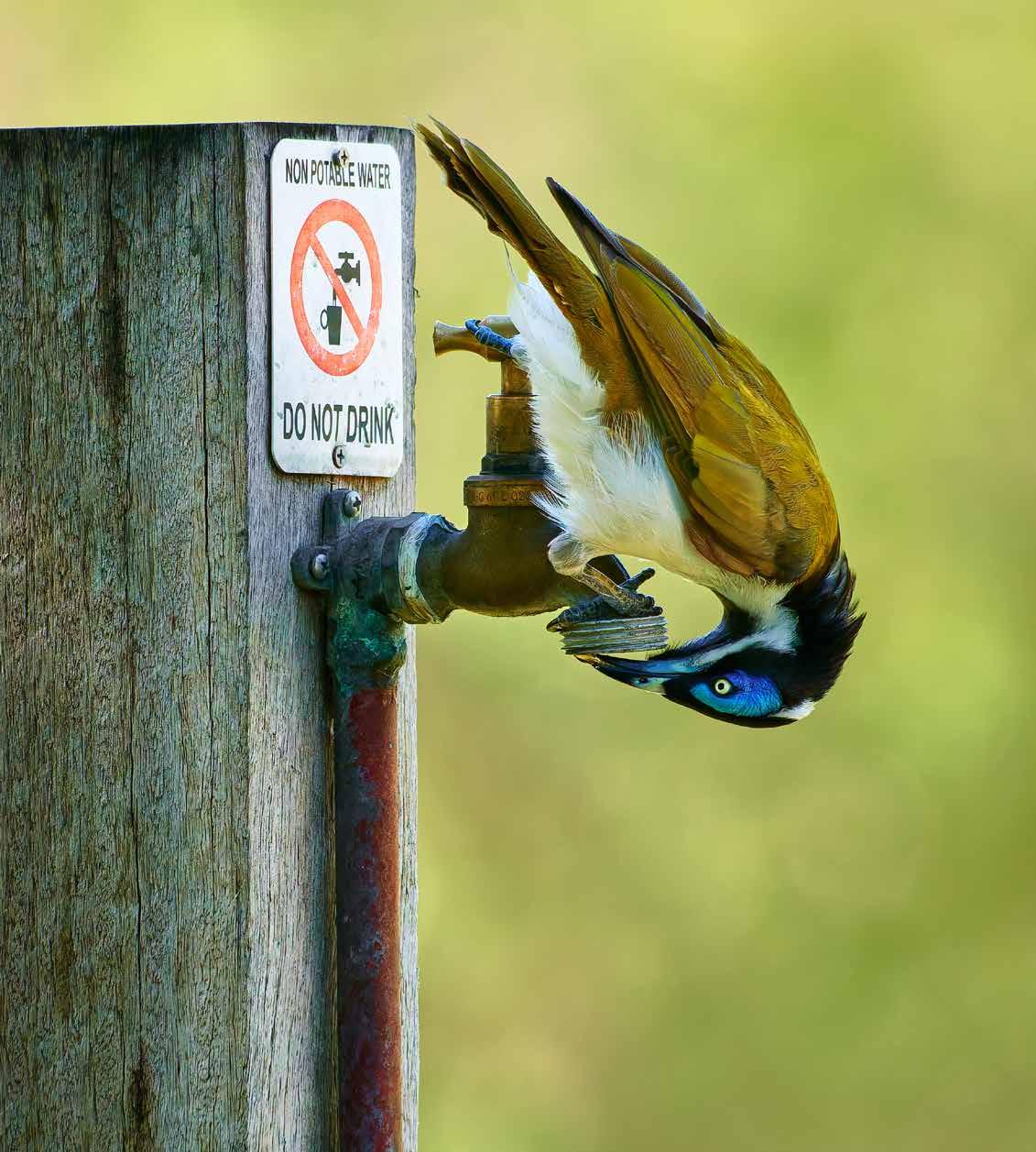 I kdybych podobnou ikonickou scénu chtěl narafičit (což jsem zásadně proti), nic lepšího už nevymyslím: nápisy „Tato voda není pitná“ a „Nepijte“, k tomu výmluvný piktogram a krásně čistý kohoutek – ne obludně zaneřáděný jako na fotce stejného motivu, který vyhrál v Bird Photographer of the Year, v bídném přímém slunci, bez nápisu i piktogramu, se „zaneprázdněným pozadím“ a bohužel stejným druhem medosavky. Nedivím se však, že porota fotku ocenila i přes všechny ty technické nedostatky – krásnější druh medosavky v celé čeledi o téměř dvou stech druhů totiž není.