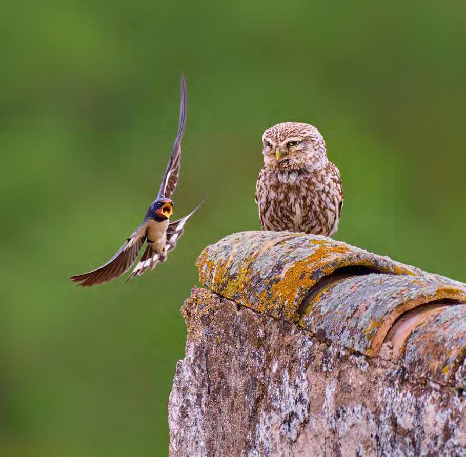 Vlaštovka obecná (Hirundo rustica ) & sýček obecný (Athene noctua )