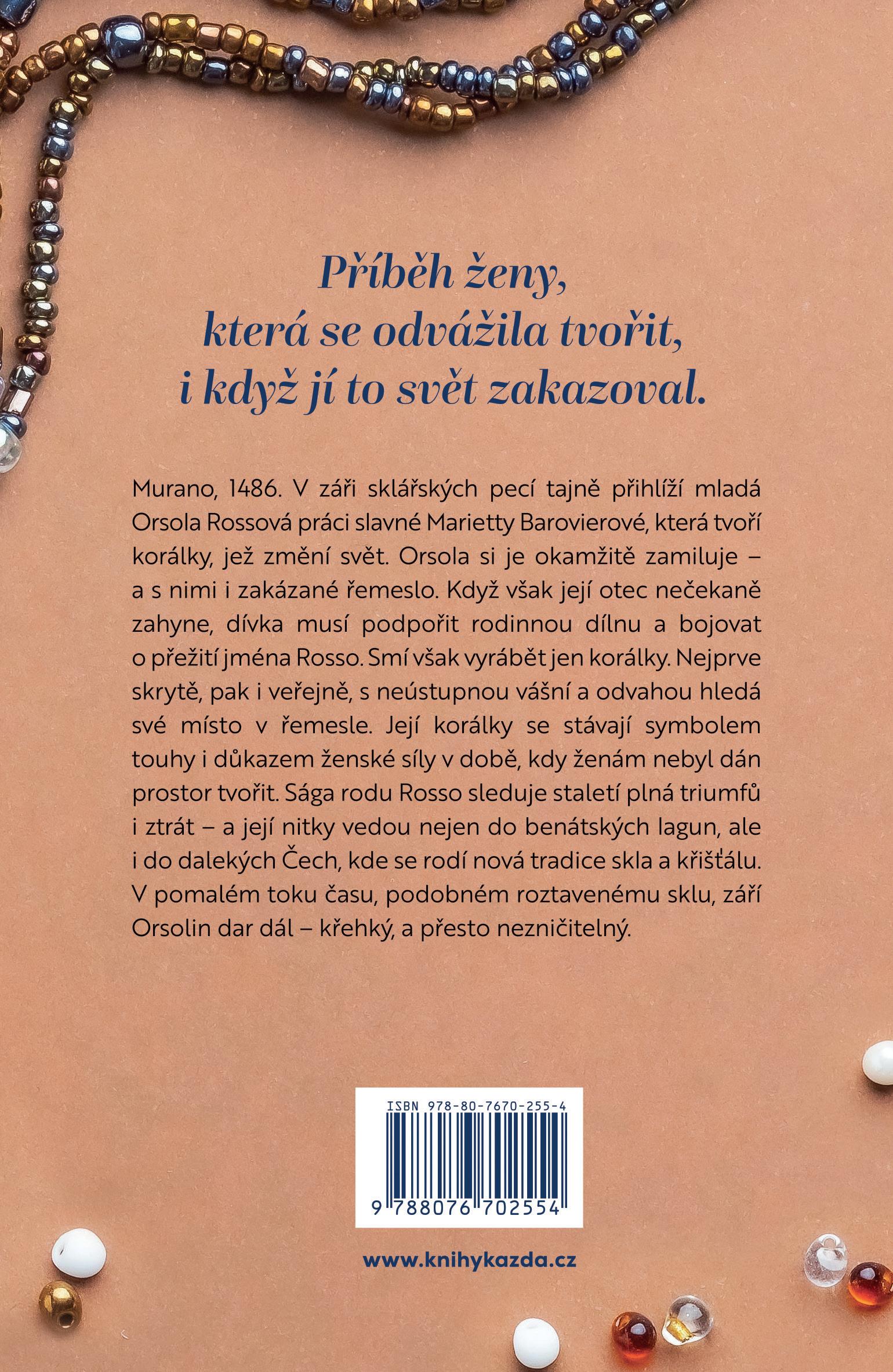 „Říkala, že červená je důležitá. Pro vyváženost.“ Orsola se zastavila. „Rossová,“ zopakovala. Jméno jejich rodiny. Najednou si uvědomila, že Maria Barovier věděla, že je Rossová – poznala, čí Orsola je. Matce ale Orsola neřekla, že ji sklářka nazvala špionkou. „Šlo o korálky. Mluvila o formě. Korálky! Červené, bílé a modré korálky. A nejen natahované tyčinky, ale i tvarované.“ Matka vypadala zamyšleně. „Per favore, dej ty špinavé šaty a košili na hromadu a najdi si na sebe něco suchého. O těch korálcích nikomu ani slovo. Musím to říct tvému otci.“