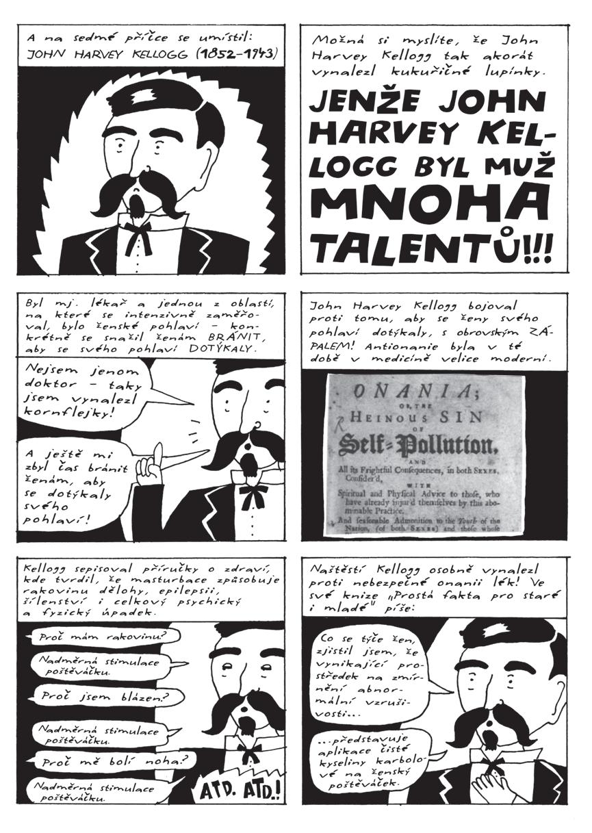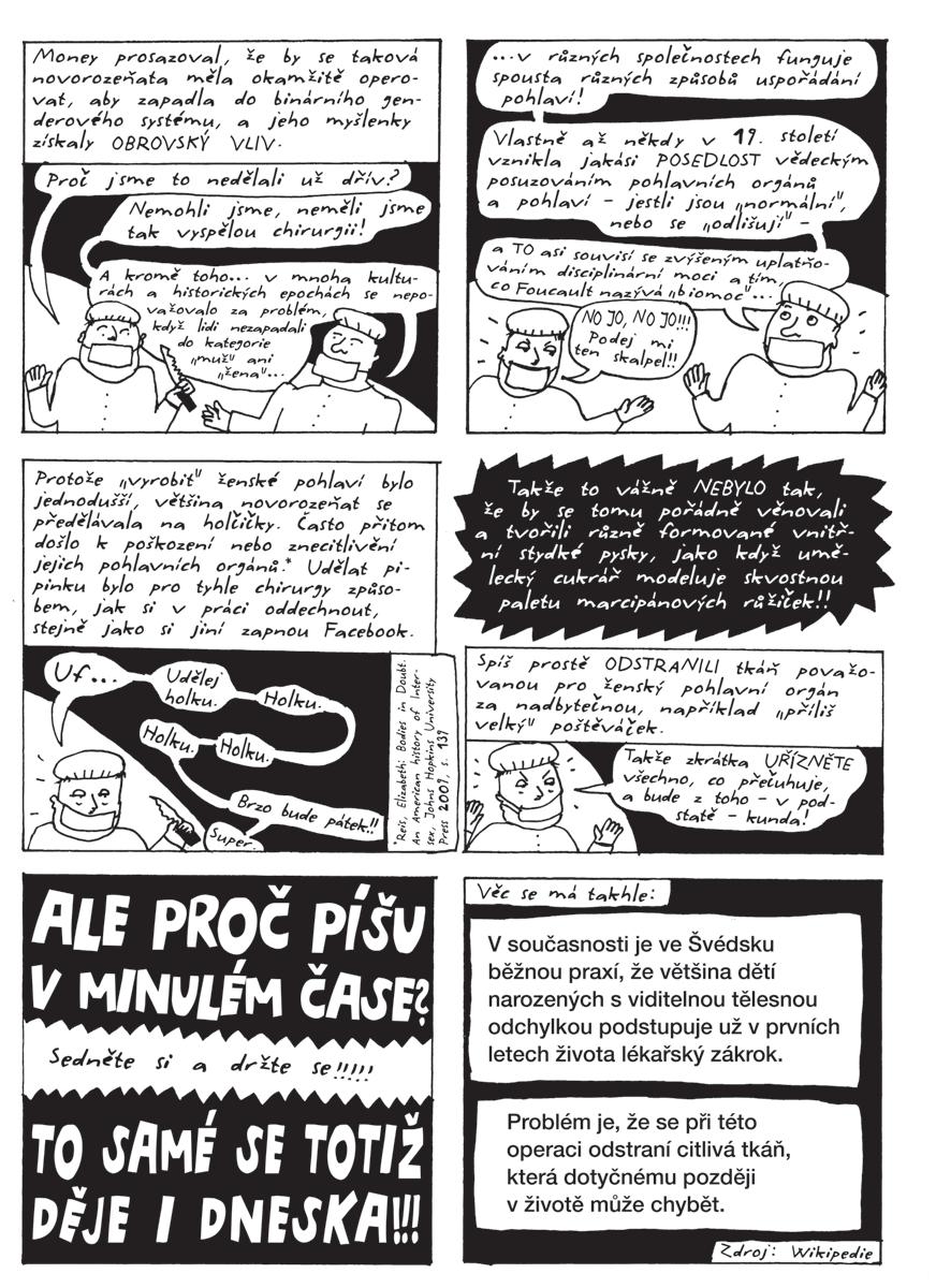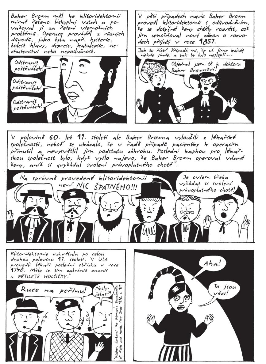 Švédská autorka dráždivých komiksů Liv Strömquistová přivádí na scénu ženy doby kamenné, staré Řeky, Sigmunda Freuda, Šípkovou Růženku, vynálezce kukuřičných lupínků, hinduistické bohyně, rappery, zdravovědné příručky i Kateřinu Janouchovou a vytváří ve svém naučném komiksu impozantní portrét orgánu, který malíř Gustave Coubert nazval Původem světa. Z této jediné učebnice biologie, kterou si skutečně musíte přečíst, se dozvíte nejen o tajemství ženského orgasmu a menstruačních mýtech, ale třeba také to, proč si Marie Bonapartová nechala operativně upravit klitoris nebo proč je na měděné destičce, kterou lidstvo vyslalo do vesmíru, ženské přirození cenzurováno.