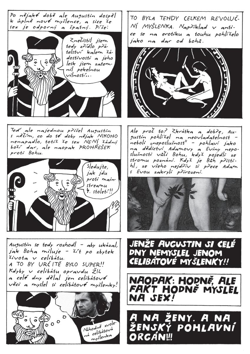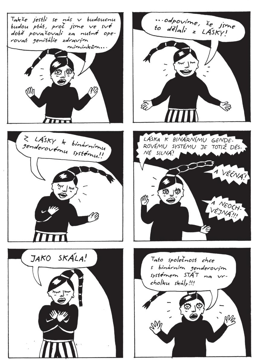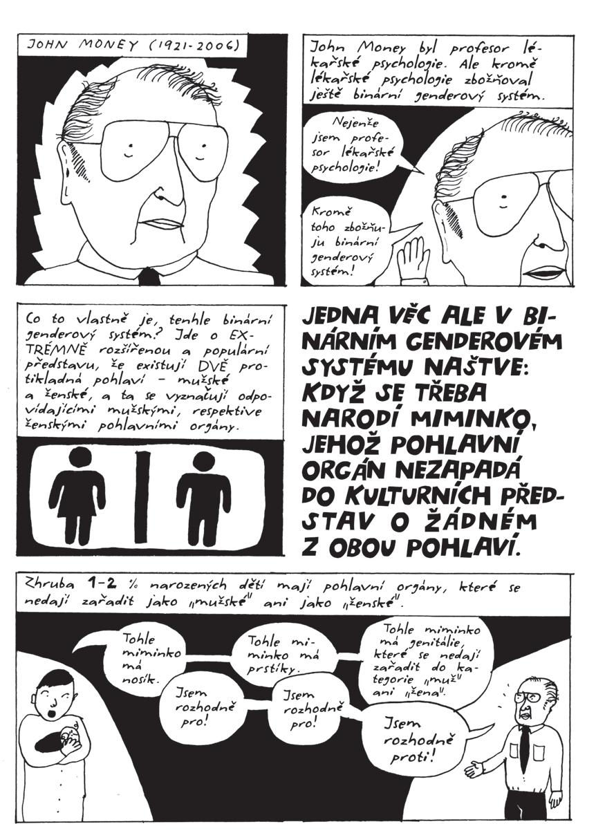 Švédská autorka dráždivých komiksů Liv Strömquistová přivádí na scénu ženy doby kamenné, staré Řeky, Sigmunda Freuda, Šípkovou Růženku, vynálezce kukuřičných lupínků, hinduistické bohyně, rappery, zdravovědné příručky i Kateřinu Janouchovou a vytváří ve svém naučném komiksu impozantní portrét orgánu, který malíř Gustave Coubert nazval Původem světa. Z této jediné učebnice biologie, kterou si skutečně musíte přečíst, se dozvíte nejen o tajemství ženského orgasmu a menstruačních mýtech, ale třeba také to, proč si Marie Bonapartová nechala operativně upravit klitoris nebo proč je na měděné destičce, kterou lidstvo vyslalo do vesmíru, ženské přirození cenzurováno.