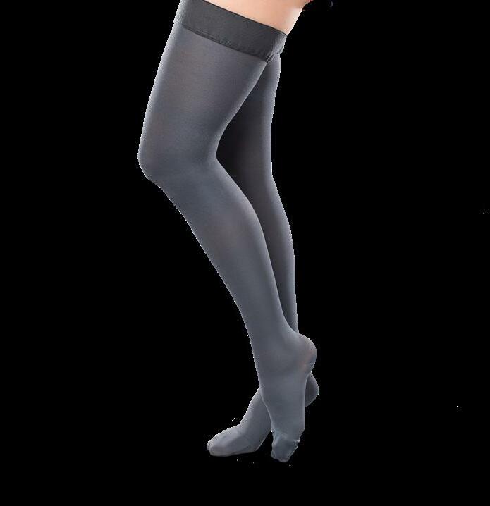 Thigh high stockings for full length compression therapy. Features breathable silicone band to keep stockings in place all day. Reinforced toe and heel for durability.