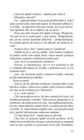 „Musí být úplně vyšinutá,“ odtušil jsem váhavě. „Připadala vám tak?“ „Ne – upřímně řečeno byla podivně přesvědčivá. Když jsem ji poslouchal, měl jsem dojem, že skutečně udělala to, co tvrdila – že způsobila obrovský zázrak, dá-li se to tak říct. Ona upřímně věří, že to udělala, tak asi proto –“ „Proto jste řekl, že musí být úplně vyšinutá. Přesně tak. Ale teď se na to podívejme z jiné strany. Předpokládejme, že ten zázrak skutečně způsobila – předpokládejme, že osobně zničila jak budovu, tak několik set lidských životů.“ „Pouhou silou vůle?“ zeptal jsem se s úsměvem. „Takhle bych to zrovna neřekl. Jistě budete souhlasit, že jediná osoba toho může zničit velice mnoho pouhým stisknutím vypínače ovládajícím systém min.“ „Ano, ale to je mechanická záležitost.“ „Pravda, je mechanická, ale ve své podstatě tu jde o ovládnutí přírodních sil. Bouřka a elektrárna jsou ve své podstatě totéž.“ „Ano, ale abychom mohli ovládnout bouřku, musíme použít mechanické prostředky.“ Rose se usmál. „Teď na chvíli odbočím od tématu. Existuje látka zvaná libavková silice. Získává se z jedné volně rostoucí rostliny, ale také se dá syntetizovat v laboratoři.“ „A co z toho plyne?“ „Chci jen poukázat na to, že často existují dvě cesty, jak dosáhnout stejného výsledku. Naše cesta je, přiznejme si, ta syntetická, ale může existovat i jiná. Tak například neobyčejné věci, které dokážou indičtí fakíři, se nedají jen tak lehce vysvětlit. To, čemu říkáme nadpřirozeno, jsou jen přirozené jevy, jejichž zákonitostem zatím nerozumíme. „Co tím chcete říct?“ zeptal jsem se udiveně. „Chci říct, že nemohu úplně vyloučit možnost, že by lidská bytost mohla být schopna vypustit nějakou nesmírně ničivou sílu a použít ji k prosazení svých cílů. Prostředky, 15