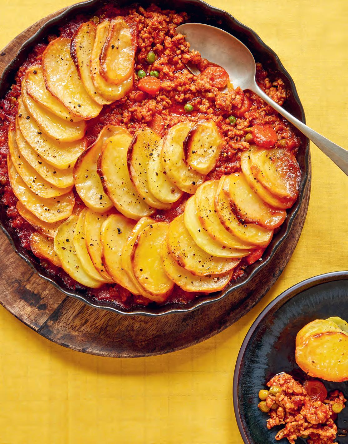 3/ Mezitím omyjte brambory, zbavte je oček a nakrájejte na asi 4 mm silné plátky. K masu vsypte hrášek a zamíchejte. Přendejte do většího pekáče nebo zapékací mísy. Navrch rozložte brambory a pokropte je rovnoměrně olejem. Dejte do trouby a pečte 30 minut, nebo dokud nejsou brambory opečené do světle hněda.