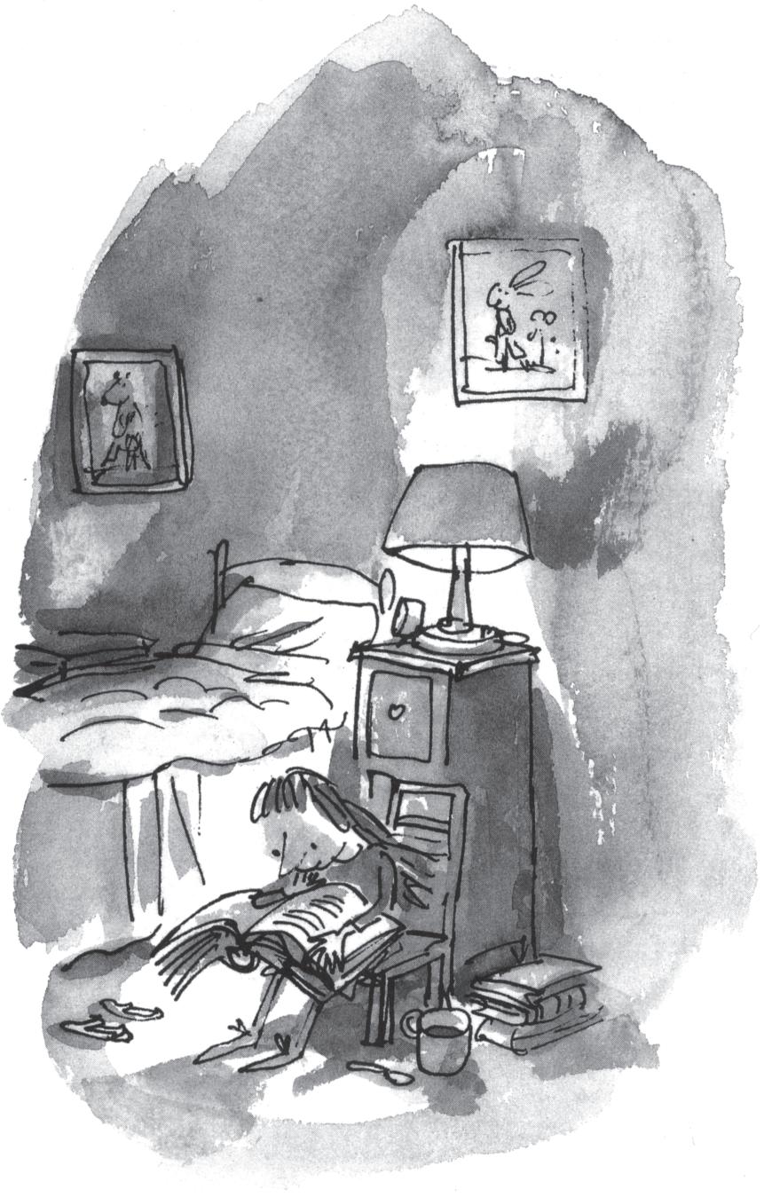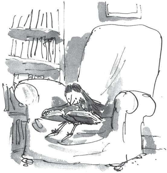 nutné opírat knihu o klín, protože na držení byla příliš těžká, a to znamenalo, že aby mohla číst, musela Matylda sedět nahnutá dopředu. Byl to zvláštní pohled na tu drobnou tmavovlasou osobu sedící s nohama nedosahujícíma na podlahu, naprosto zaujatou báječnými dobrodružstvími Pipa a staré slečny Havishamové a jejím domem pokrytým pavučinami a kouzelnými okamžiky, které Dickens, ten úžasný vypravěč, upředl ze slov. Jediným pohybem čtenářky bylo občasné zvednutí ruky a otočení stránky, a paní Phelpsová vždy pociťovala smutek, když nadešel čas a musela jít a říct: „Je za deset minut pět, Matyldo.“