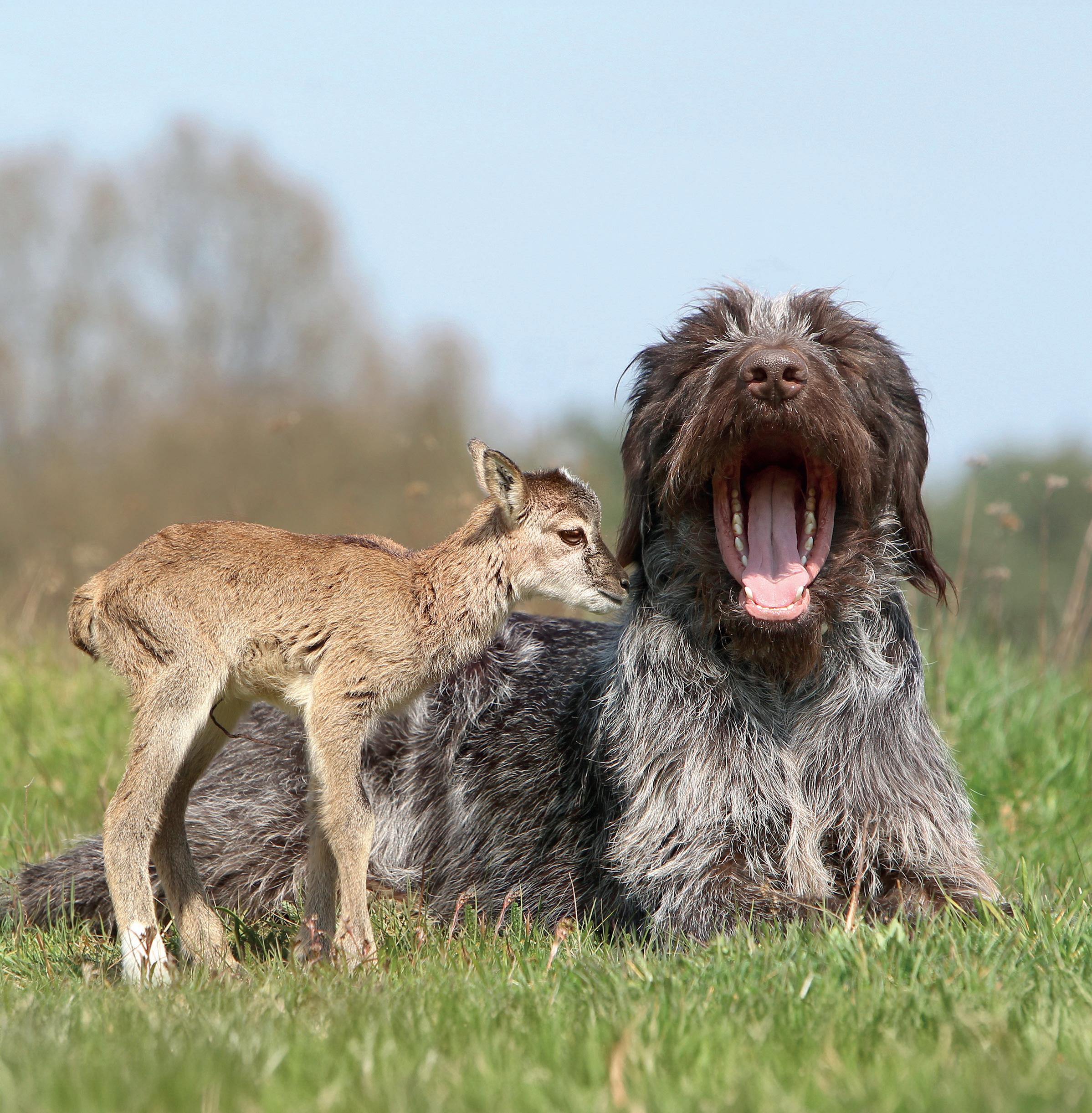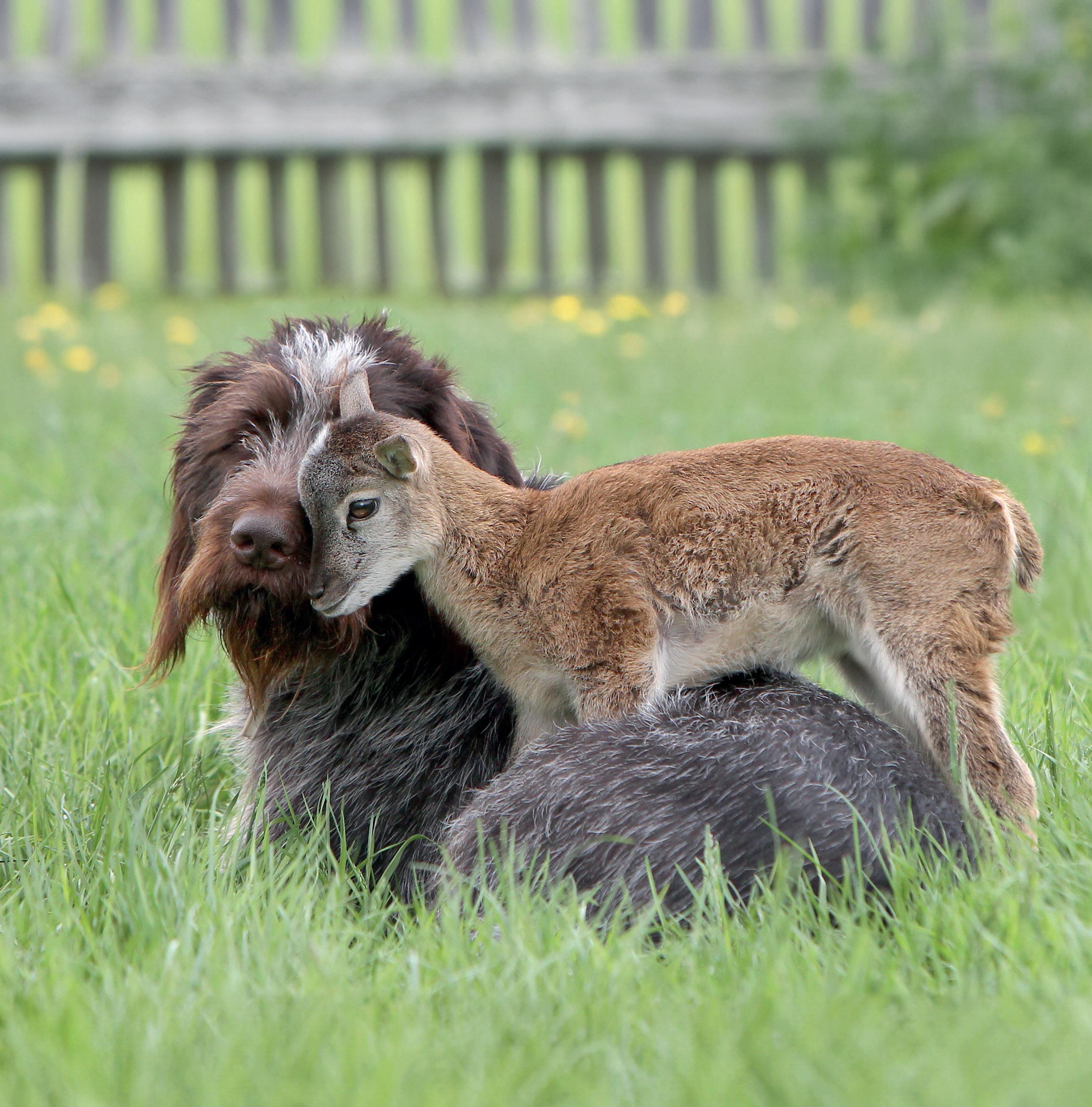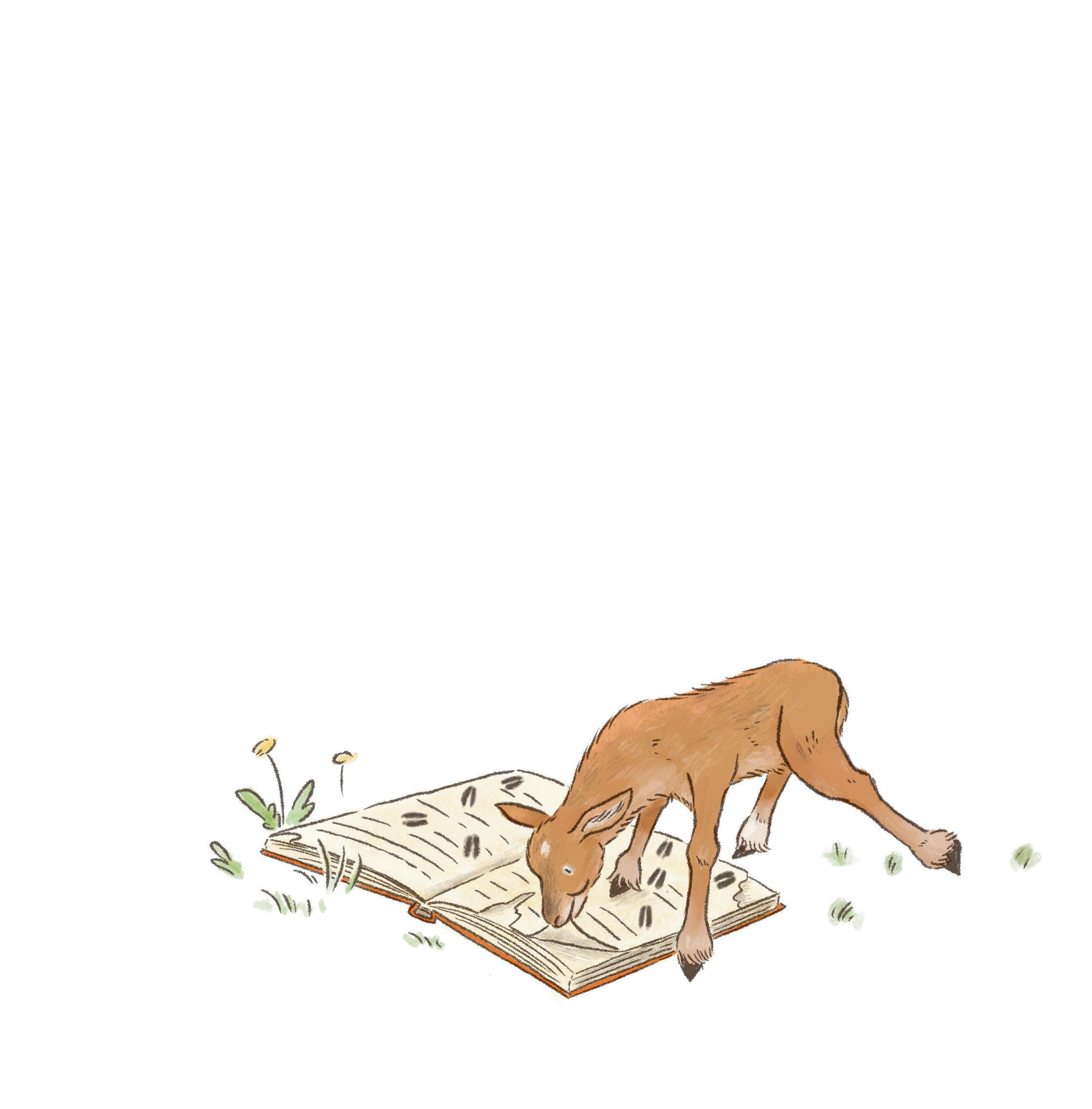 Zdá se mi hezký sen: odpočívám v dolíku měkké trávy a maminka mě zahřívá. Vtom uslyším zafunění. Otevřu oči a hrozně se leknu. Zblízka na mě hledí veliké zvíře! Fousatá tlama se olízne dlouhatánským jazykem a vycení obrovské zuby. Brrr! Takové měl vlk z pohádky O Červené karkulce! Co teď? Zasunu se nenápadně zpátky pod deku. Krčím se jako myška a jedním očkem toho vlka pozoruju. Nebo to není vlk? Jeho oči jsou vlastně docela přátelské. Krátká tmavá srst mi dokonce připomíná mámu. Kouknu na zvíře i druhým okem, a teď vím jistě: vlk to určitě není! Ale muflon taky ne! Ten přece nemívá tak legračně střapatou hlavu ani plandavé uši a jazyk. Už to