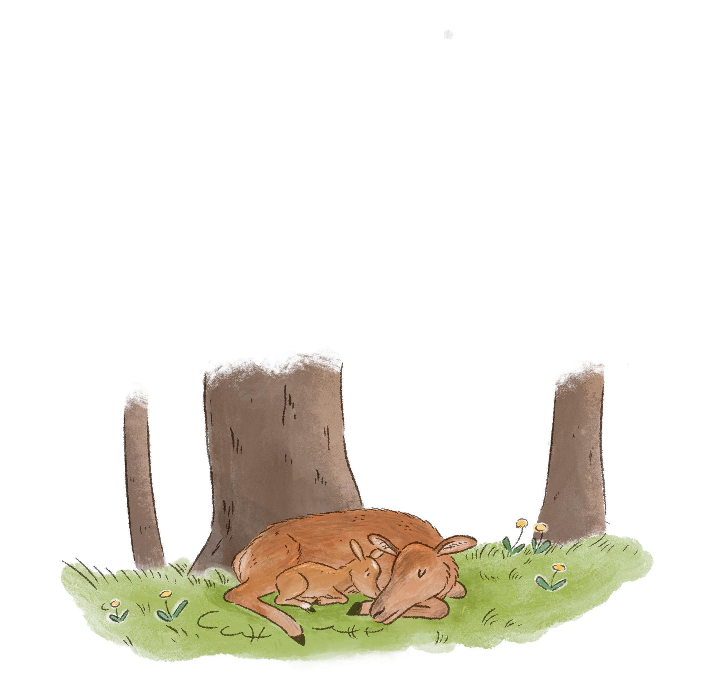 jehličí a ještě něco: tak voní mufloní miminka a mlíčko, které pijí od své mámy. Začínám mít hlad, ale nevím, co mám dělat. Moje maminka pořád leží, nechodí okolo mě a nečistí mě, jako to dělají ty druhé. Nehýbá se, má zavřené oči a jen slabě dýchá.