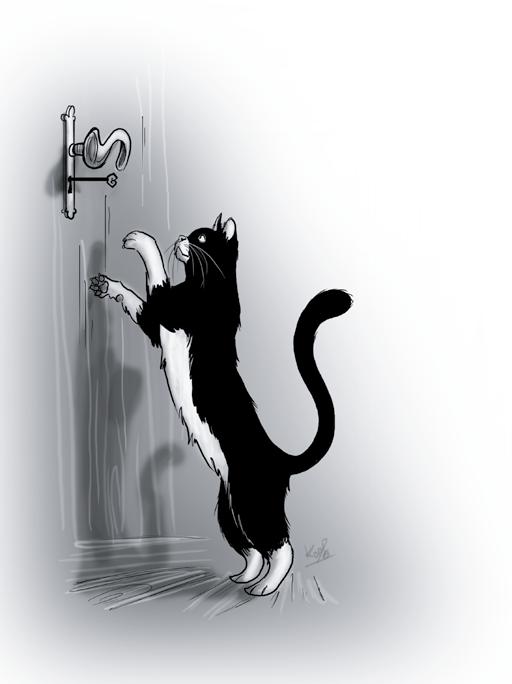 Na chodbě skutečně seděla Barča. Když zjistila, že drápání na dveře přineslo kýžený výsledek, rychle se zvedla a popoběhla ke dveřím na půdu. Stoupla si před ně, upřeně se dívala na kliku a rozčileně mňoukala.