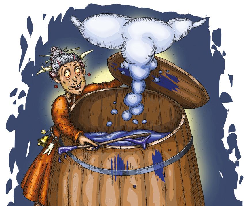 Jde do spíže a přinese si potřebné ingredience, hmoždíř a železný řetěz. Počítá si nahlas na prstech: „Tak to máme pět kilo popela, na to připadá pět a čtyři…, takže pětačtyřicet vajec. Tím pádem… počkat,“ zaťuká si na hlavu. „Ano, čtyři kousky budou bohatě stačit.“