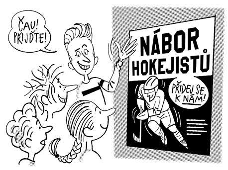 hlouček dětí postávajících u velké nástěnky. Standa, veselý pihovatý dlouhán z 3. B a člen místního hokejového klubu, tam právě přišpendloval velký plakát s nápisem NÁBOR HOKEJISTŮ, PŘIDEJ SE K NÁM! Když postřehl, jak si Tom, Julča a Jirka plakát prohlížejí, oslovil je: „Čau, nechcete se přijít podívat? V sobotu máme velkou akci na zimáku, nabíráme nové hokejisty!“ vyhrkl nadšeně. Kamarádi nic neříkali, jen se rozpačitě usmívali.
