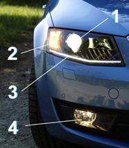 vpředu: 1. kombinované světlo potkávací a dálkové (lesklá plocha vpravo je pouze designový prvek) / 2. Směrové / 3. kombinované světlo denního svícení a obrysového světla / 4. světlo mlhové.