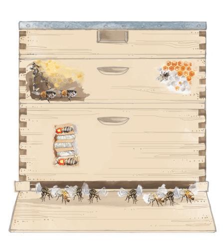 3 Nástavky – Nahoře i dole otevřené čtvercové boxy (medníky), kam včely ukládají med. Obvykle je v nástavku podle typu úlu 9–13 rámků oddělených mezerníky.