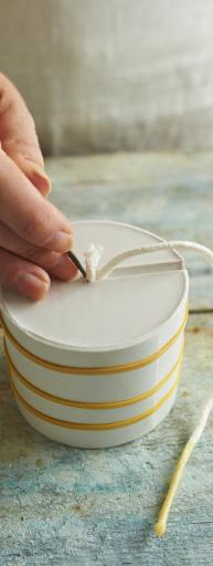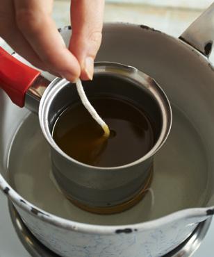 Vosk v kastrolku rozpusťte ve vodní lázni nebo ve dvojitém hrnci (viz str. 178). Navoskujte konec knotu ponořením do rozpuštěného vosku.
