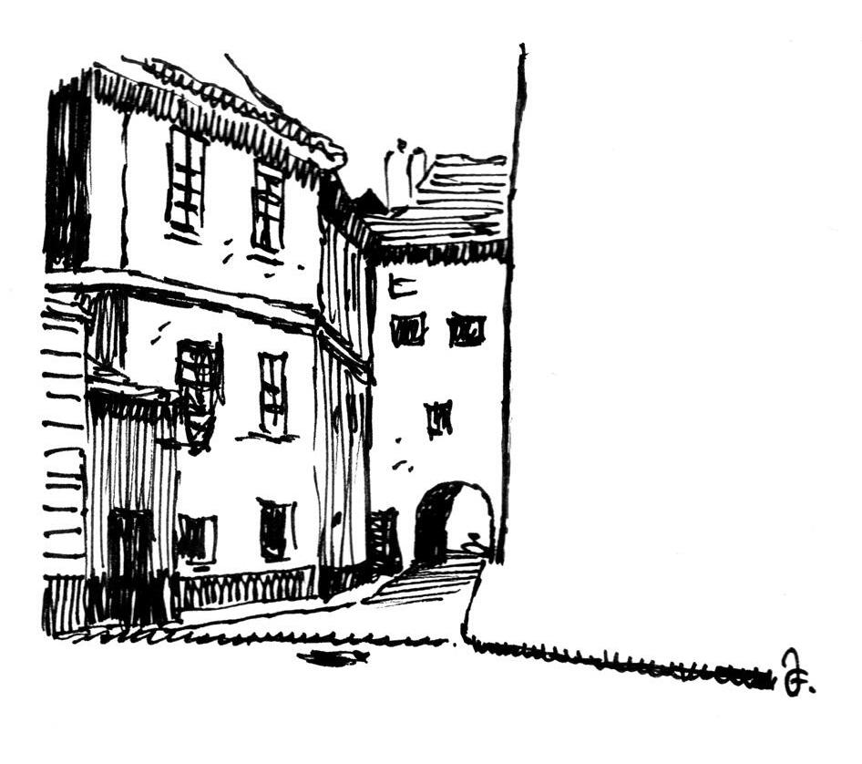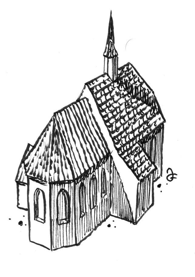 Takto vypadal první gotický kostelík zopukových kvádříků sv. Maří Magdaleny; nakreslen podle předlohy M. Semeráda zNPÚ Praha.