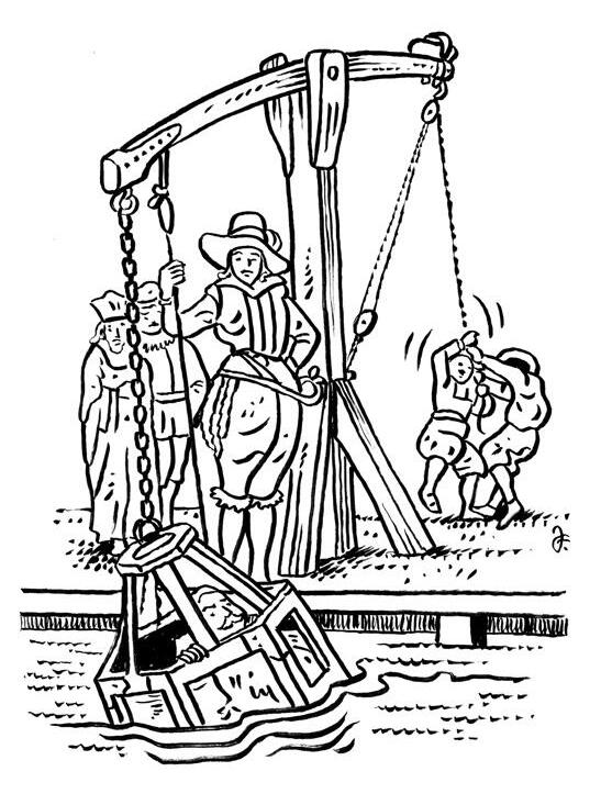 proutěného koše zavěšeného na silných lanech na dlouhé páce vyčnívající nad vodou ajejich ponoření do vltavské vody bývalo prý vždy bezpečné: hlava se jim totiž nedostala pod hladinu. Tento trest se zřejmě konal až do konce 18. století, kdy ho zrušil císař Josef II.