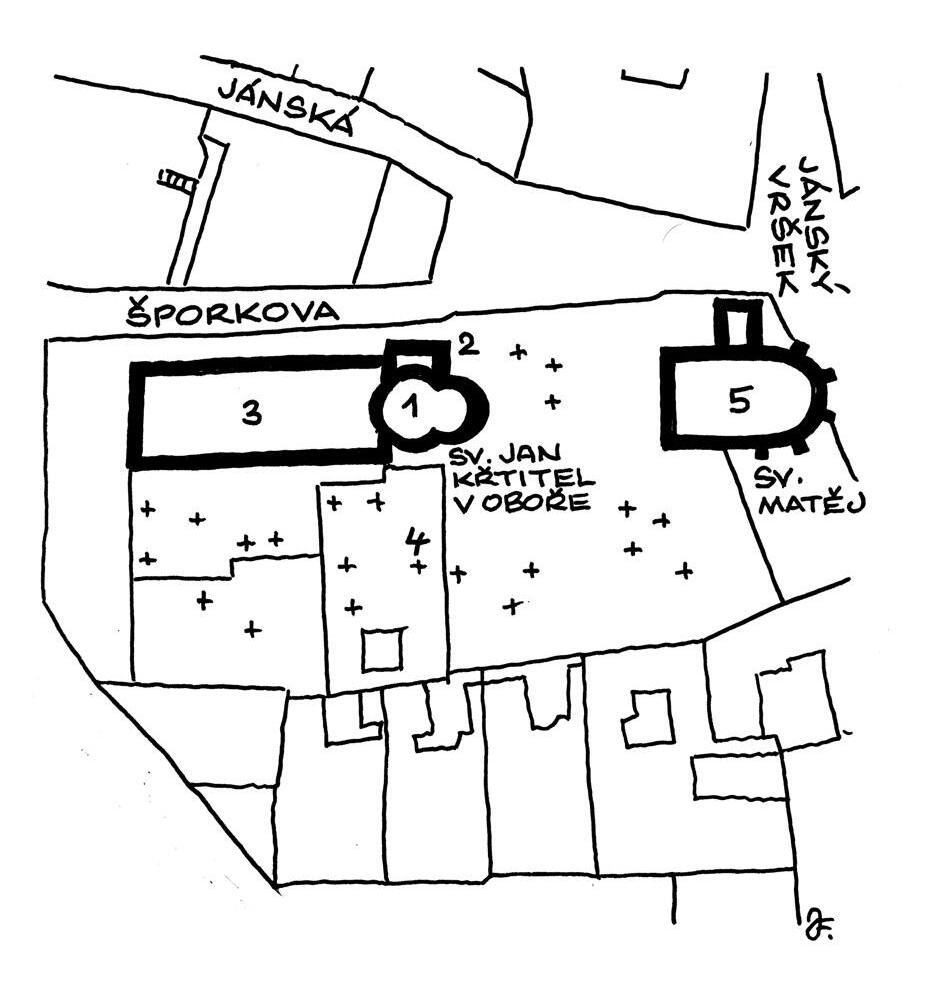 Mapka zachycuje umístění přístavby církevních objektů Obory: románská rotunda sapsidou sv. Jana Křtitele (1), severní gotická sakristie znovu zvětšená v16. století (2), přistavěná nová renesanční loď (3) ahromadný hřbitov (4) pro oběti hladomoru vroce 1282. Je tu vidět také umístění nedalekého kostela sv. Matěje (5), zrušeného roku 1793.