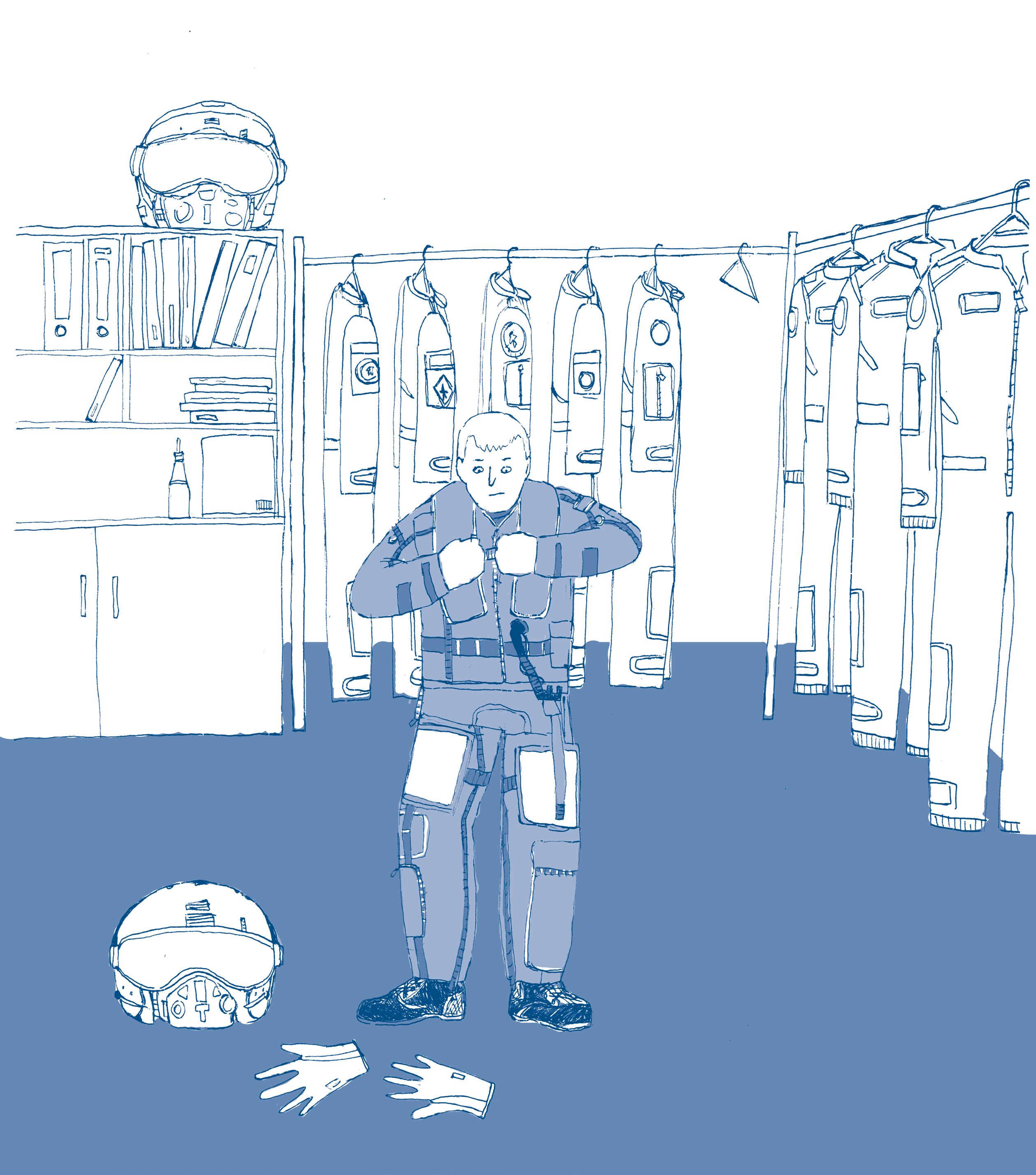 Ale zpátky k rannímu rituálu. Po příchodu na letku se pilot převlékne do letecké kombinézy. To je takový jednodílný oděv, trochu podobný dupačkám, které nosí malé děti. Takže vás jistě nepřekvapí, že taková kombinéza je velice pohodlná a jednoduše se oblékne. Kromě toho je ale také nehořlavá, což se může hodit, pokud by se v kokpitu stíhačky něco vznítilo. Ale hlavně – má na sobě spoustu suchých zipů, na které se dají nalepit různé nášivky a taky se podle ní dají piloti docela spolehlivě poznat.