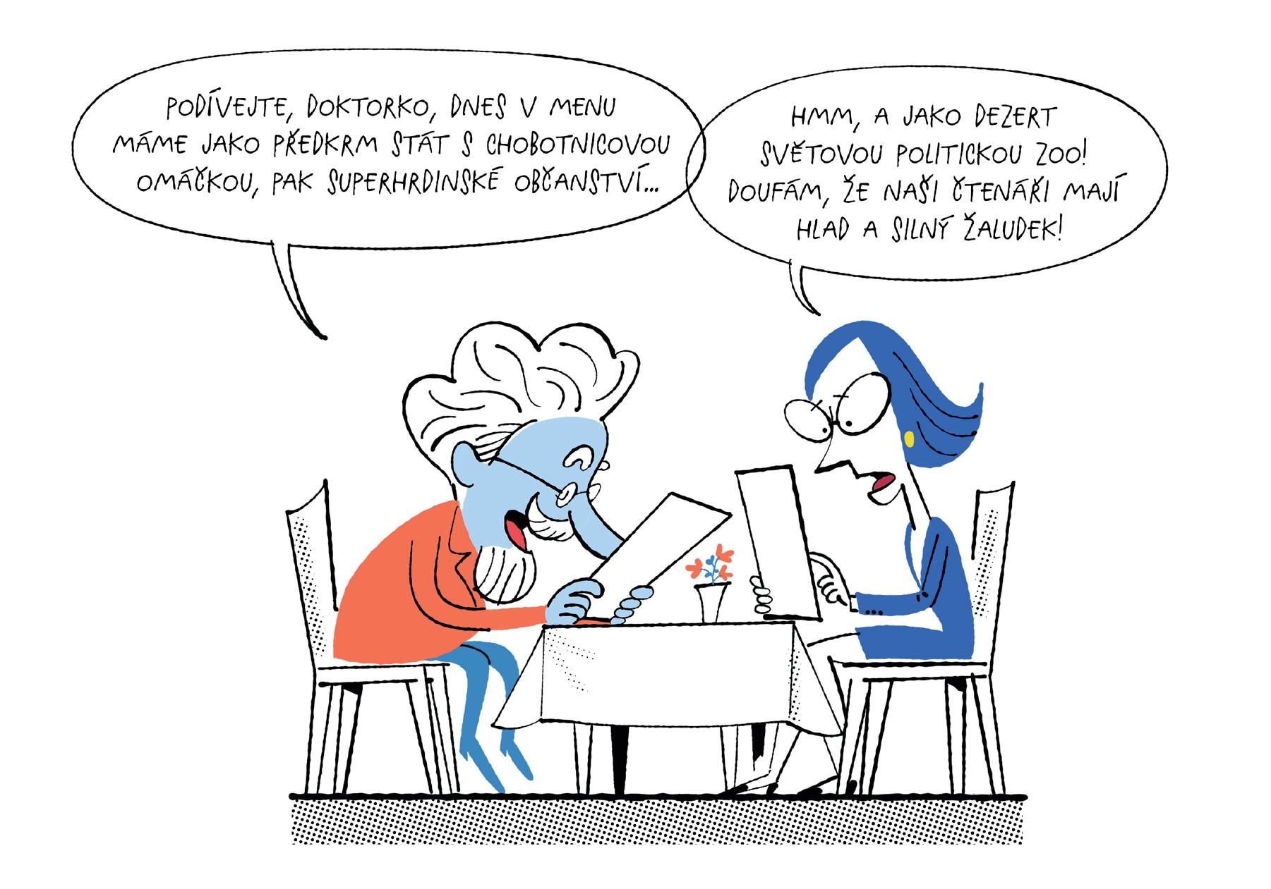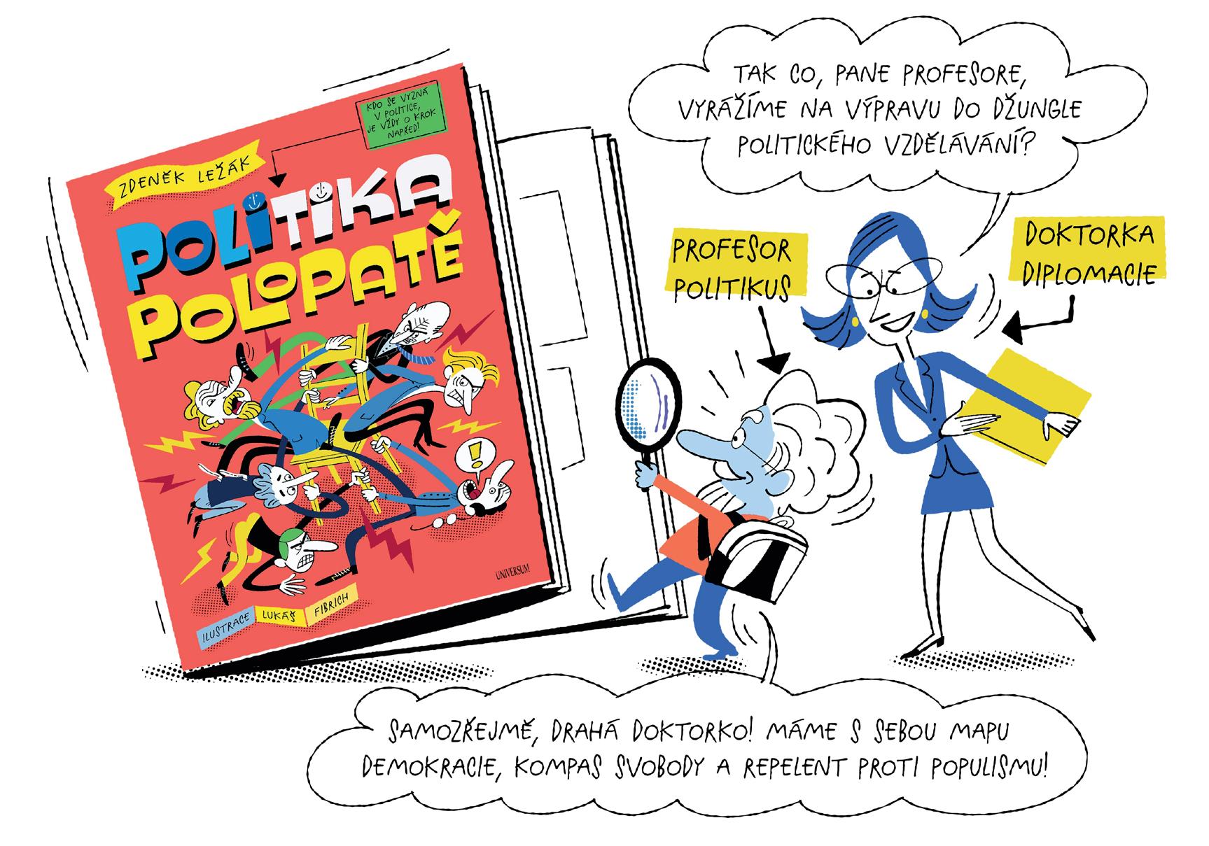 Na této cestě vás na obrázcích budou provázet dva zkušení průvodci – profesor politikus a doktorka Diplomacie. profesor je znalý všeho, co se týká politiky, doktorka Diplomacie zase umí složité věci vysvětlit jednoduše a často krotí